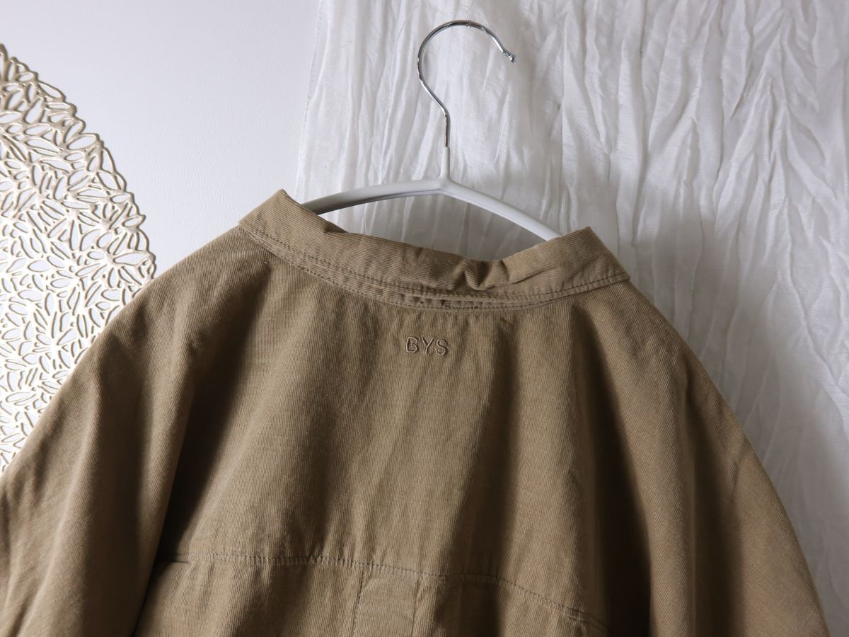 バックにスリットが入っているのでパンツをはいた時にも足さばきが良く、オシャレに合わせて頂けます。BYS刺繍を後ろ襟元にあしらっています。