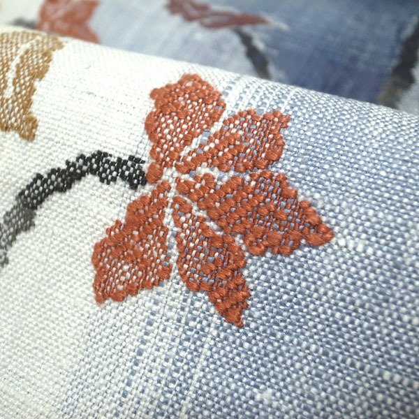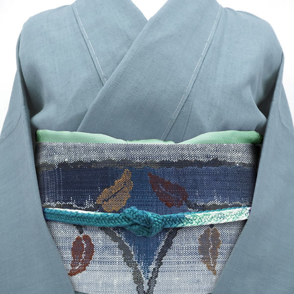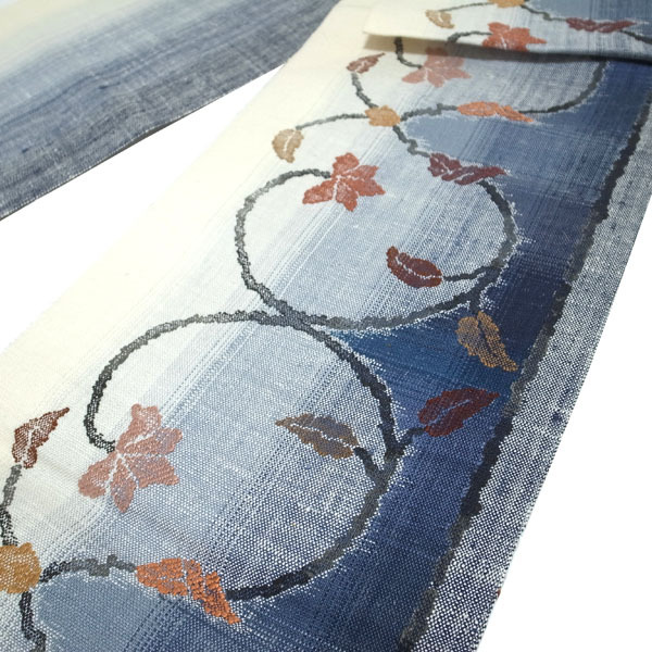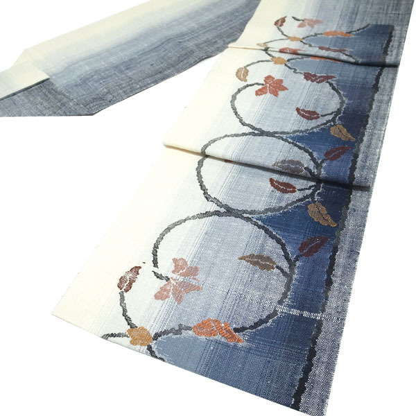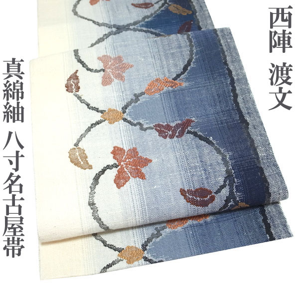 名古屋帯 八寸 京都 西陣 37 渡文 白 灰青 草花 カジュアル 普段着 小紋 紬 上質 上品 粋 春秋冬 オシャレ お洒落 美品 未使用品 未使用 未着用品 未着用 キレイ きれい 綺麗 販売 帯 なごみ 新古品 仕立て上がり品 kp2163