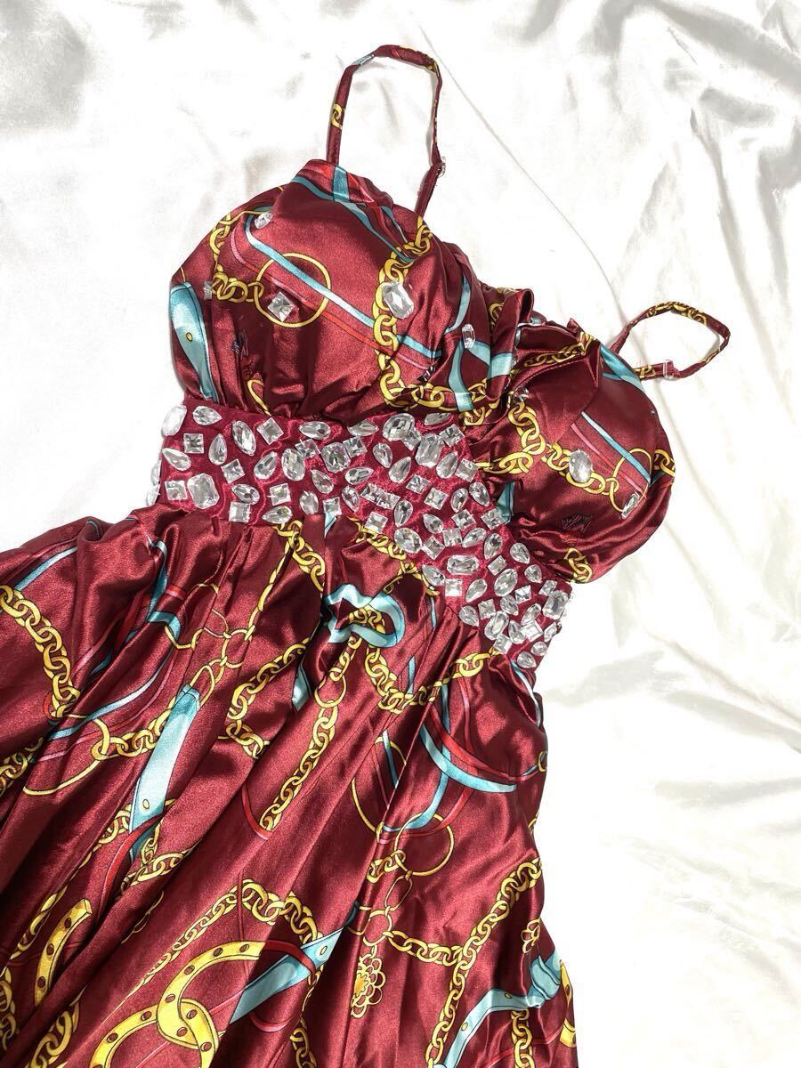 バーガンディのチェーンパターンが特徴のアシンメトリックワンピース。ビーズ装飾付きで、スパゲッティストラップデザイン。