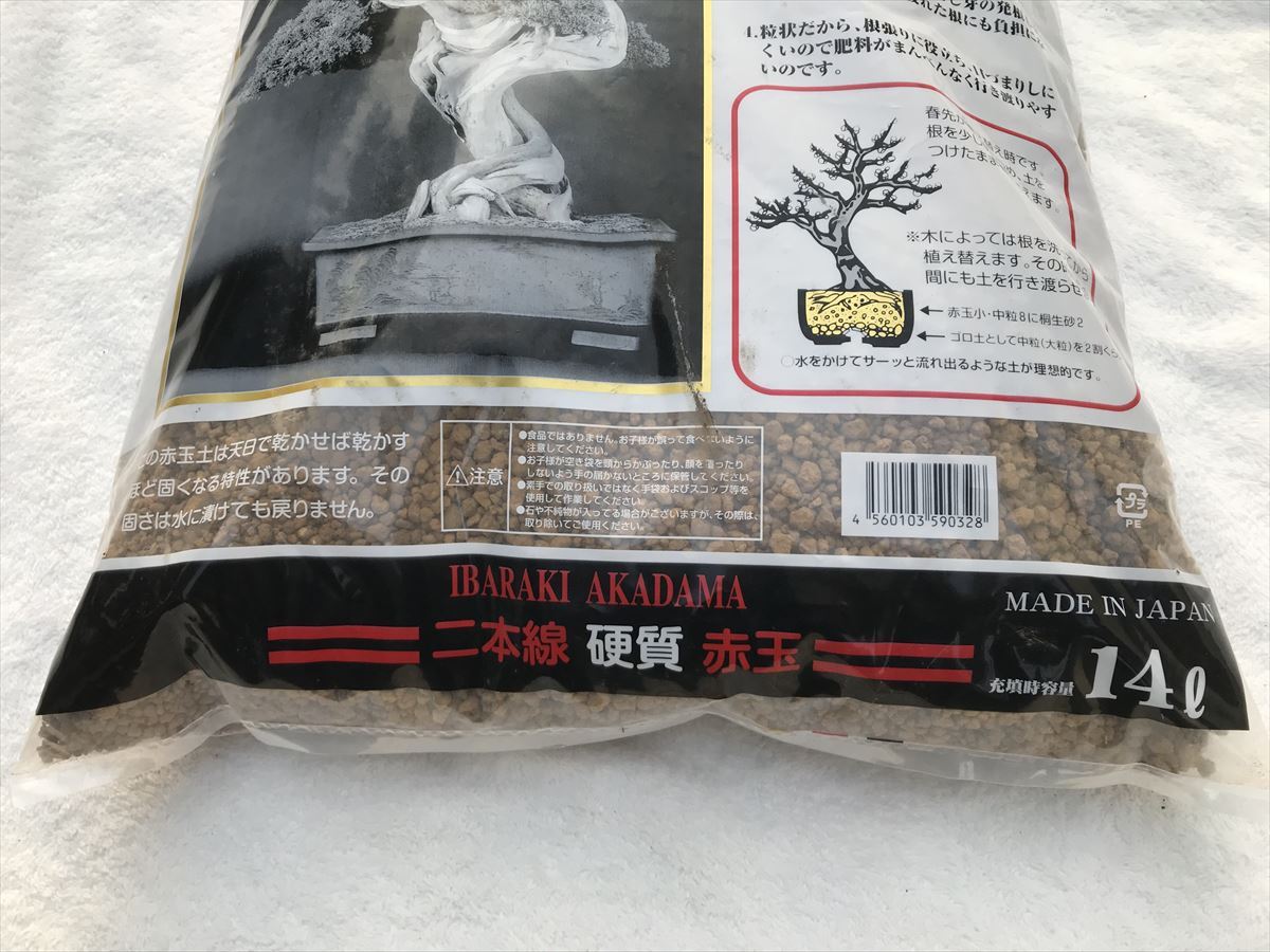 | ◆商品説明◆ | 茨城赤玉 硬質(小粒 14L) 5袋 園芸用です。 配送業者にて玄関まで配送いたします。 水戸産の赤玉土です。【二本線 硬質 赤玉】 弱酸性で、天日で乾かせば、更に固くなります。 盆栽などにご使用になれます。 内容量:14L 仕様:小粒 赤玉土の特徴: ・根の生育に必要な土の条件(通気性、排水性、保水性)を備えています。 ・土そのものが中性なので、根に負担がかかりません。 ・無肥料分なので、さし木、さし芽の発根もよく、植え替え直後のつかれた根にも負担になりません。 ・粒状なので、根張りに役立ち、目詰まりしにくいので肥料がまんべんなく行き渡ります。 |