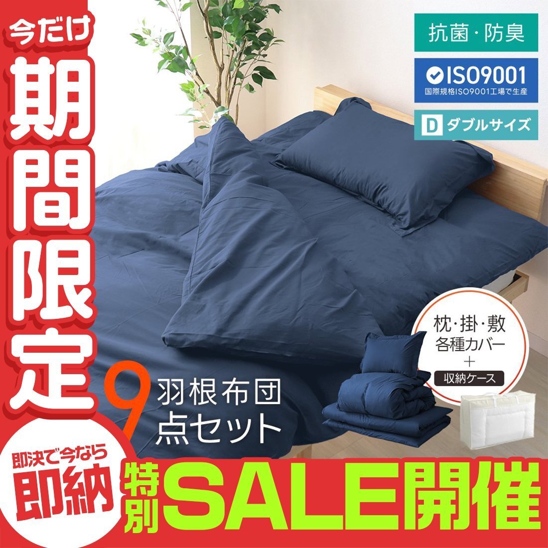 ISO9001認可工場で生産された安心の品質! 届いてすぐ使える寝具8点+収納ケースの9点セットです。 掛け布団は高級布団などにも使われるフェザーを100%使用! 冬場は暖かく、夏場は蒸し暑くなりにくいため、オールシーズン快適に過ごせます。 敷き布団はフローリングや畳の上に直接敷いても痛くないよう、 芯のある固綿を、ふんわり柔らかな中空ポリエステル綿でサンドイッチした三層式構造を採用! 底付き感を感じないボリュームで、快適な寝心地とふんわり優しく包みこまれる気持ちよさを実現! また、抗菌防臭加工が施されており、いつでも清潔に使えます。 \すぐ使えるから、こんな方におススメ♪/ ・一人暮らしや新生活を始める方 ・新生活を始める方 ・来客者用の布団一式を考える方 ・布団、寝具の買い替えを考える方 ・社員寮など業務用として考える方 【商品内容】 掛け布団、敷き布団、まくら×2、掛け布団カバー、敷き布団カバー、まくらカバー×2、収納ケース 【商品詳細】 カラー:ネイビー サイズ:ダブル(詳細は画像参照) 素材:ポリエステル、フェザー |