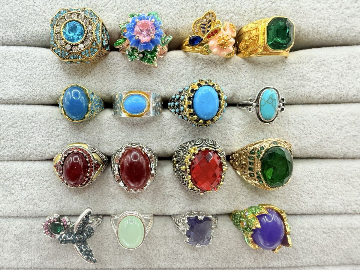 天然石、ジルコニア 、カラーストーン、色ガラス、ゴールド、シルバー、ステンレス、真鍮など様々です。