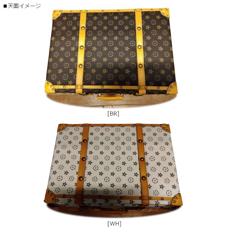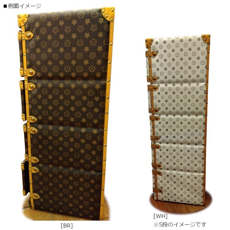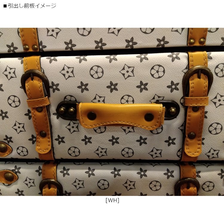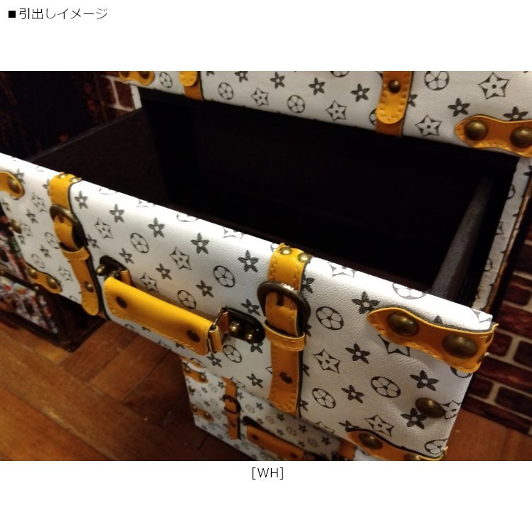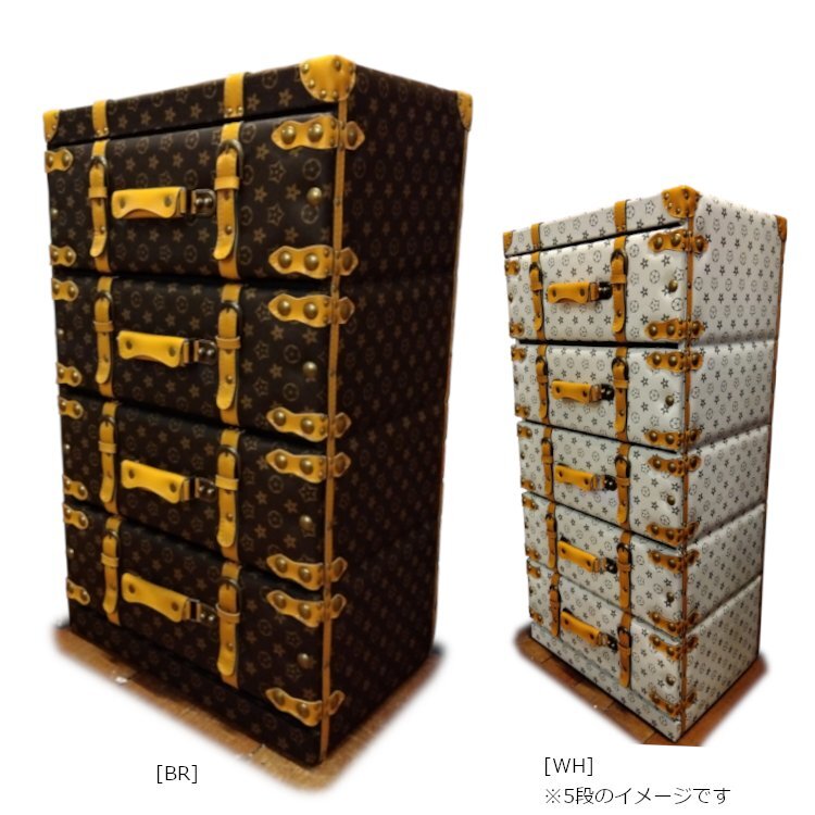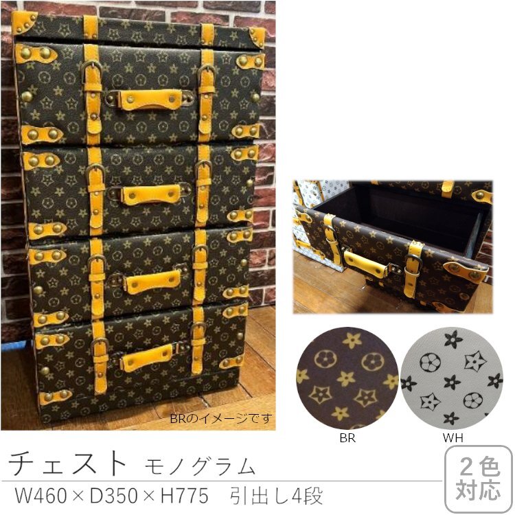 モノグラム柄のトランクデザインの存在感のあるチェストです。引出しが4杯で、収納力もたっぷり。ベルトや鋲、ハンドルなど、デザインにこだわった個性的なチェストで、お部屋のワンポイントに。カラーはブラウンとホワイトの2色、同シリーズで5段もあり、空間コーディネートが楽しめます。