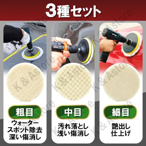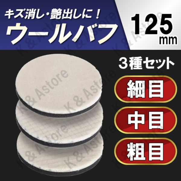 ウールバフ 羊毛 車磨き 粗目 中目 細目 電動ポリッシャー ドリル マジック式 研磨 洗車 水垢 傷消し ワックス コーティング 艶出し 125mm