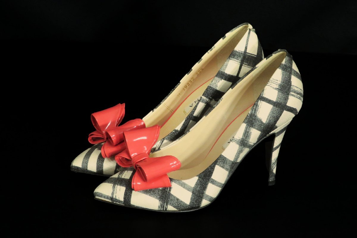 ☆美品☆DIANAダイアナ/リボン チェック柄ピンヒールパンプス:22.5/ベージュ×黒nl873