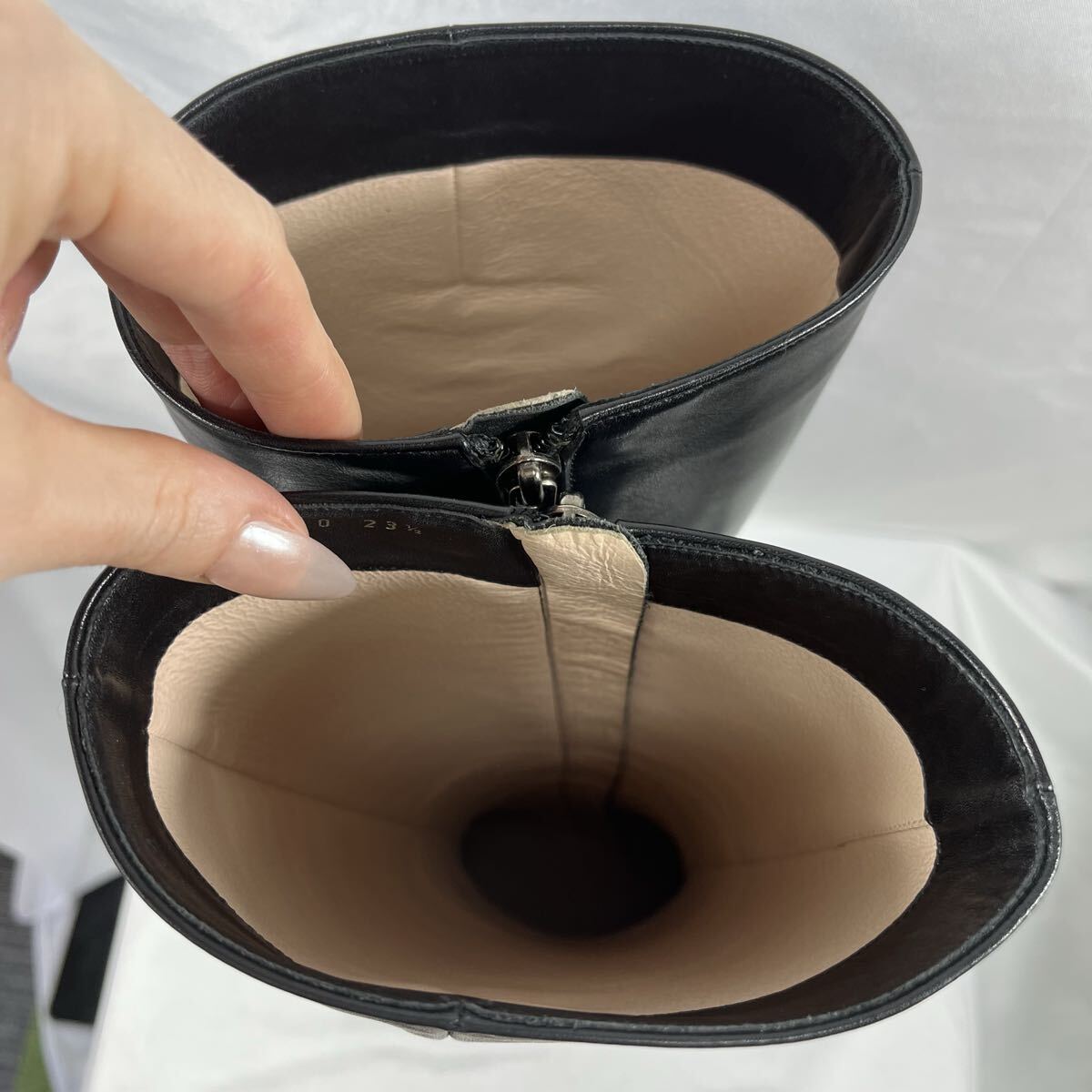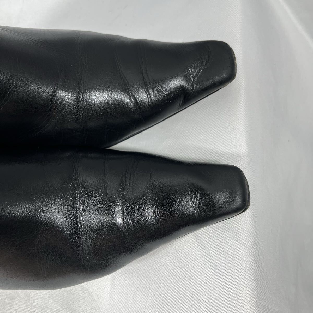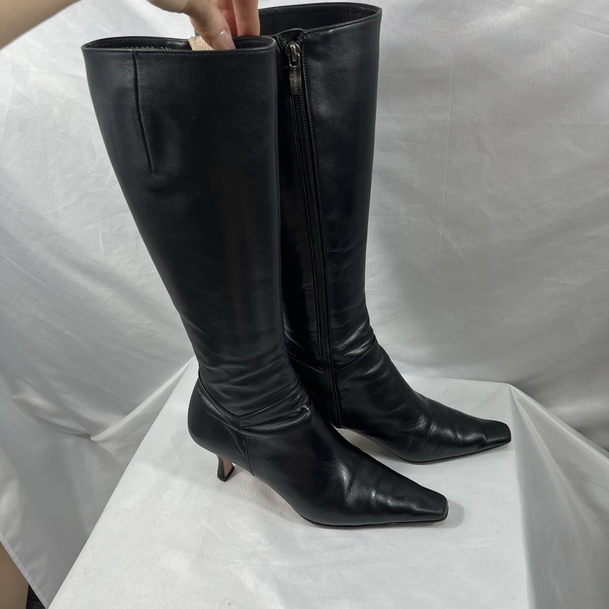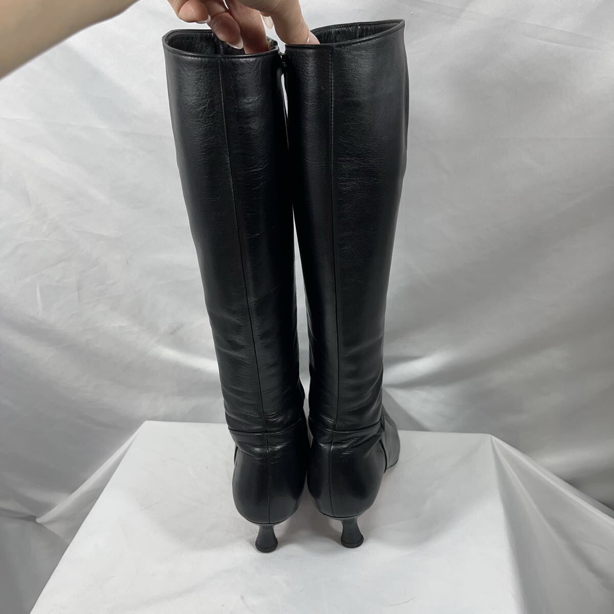 ・エレガントなデザインのブラックレザーのロングブーツ。
