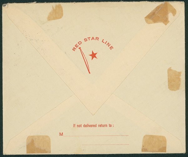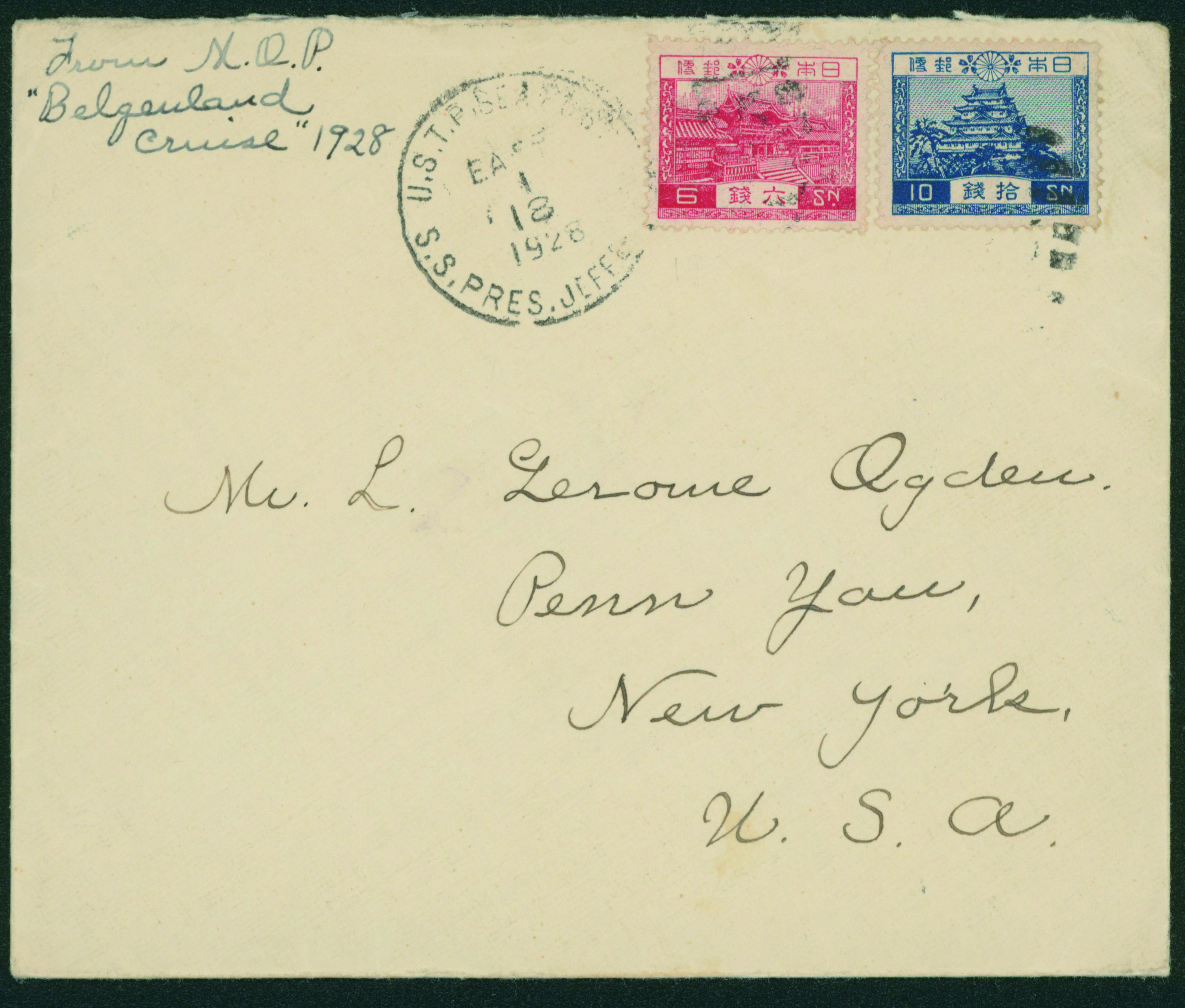 商品説明: 風景6銭毛紙, 10銭青 日付印 1928-01-18 S.S.PRES.JEFFERSON→米国 RED STAR LINEの封筒使用、裏面ヒンジ跡強いJPS 214,215