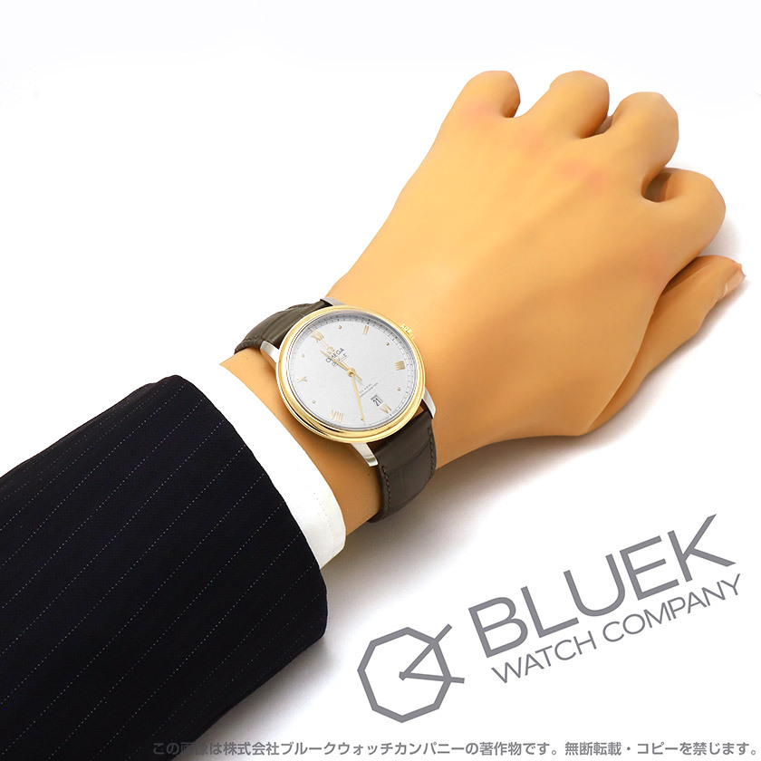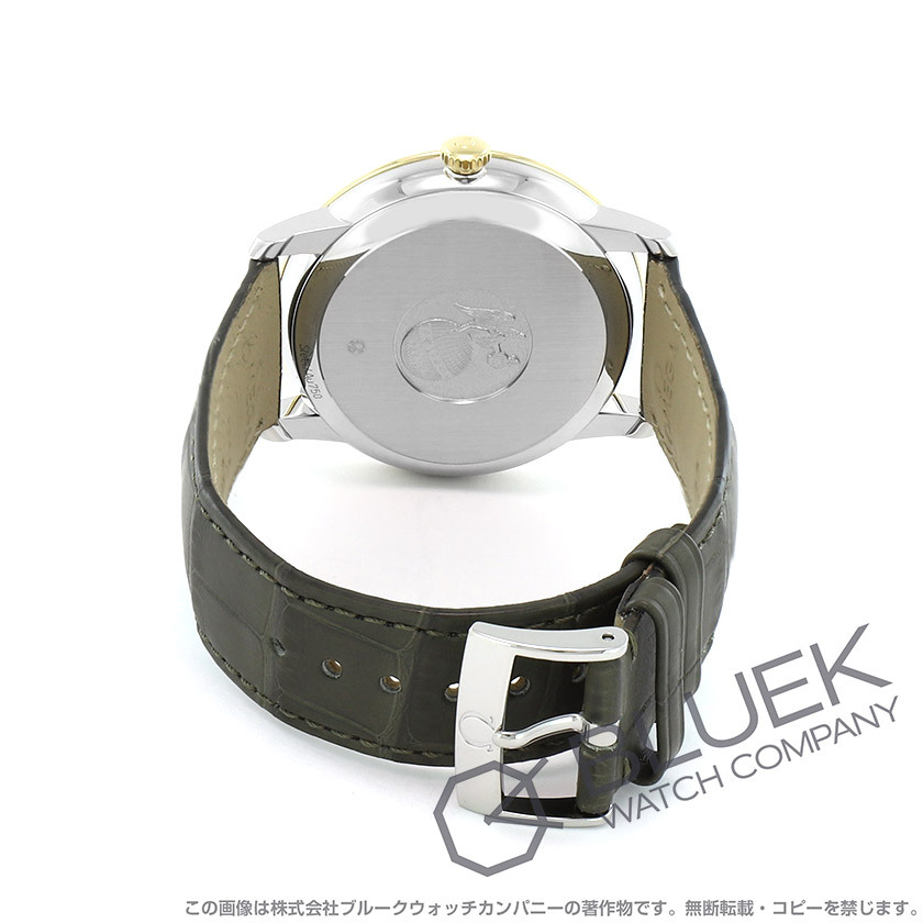 | 艶ありのシルバーステンレスケース・艶ありの18Kイエローゴールドベゼル・シルバー文字盤・イエローゴールドの指針・ローマンとドットインデックス・12時位置にブランドロゴ・6時位置に日付表示・レザー(アリゲーター)グリーンの革ベルト・穴留め式バックル・腕周り調整は約5mm幅の間隔で7段階可能・バックル部分にブランドロゴ・裏蓋にシリアルナンバー |