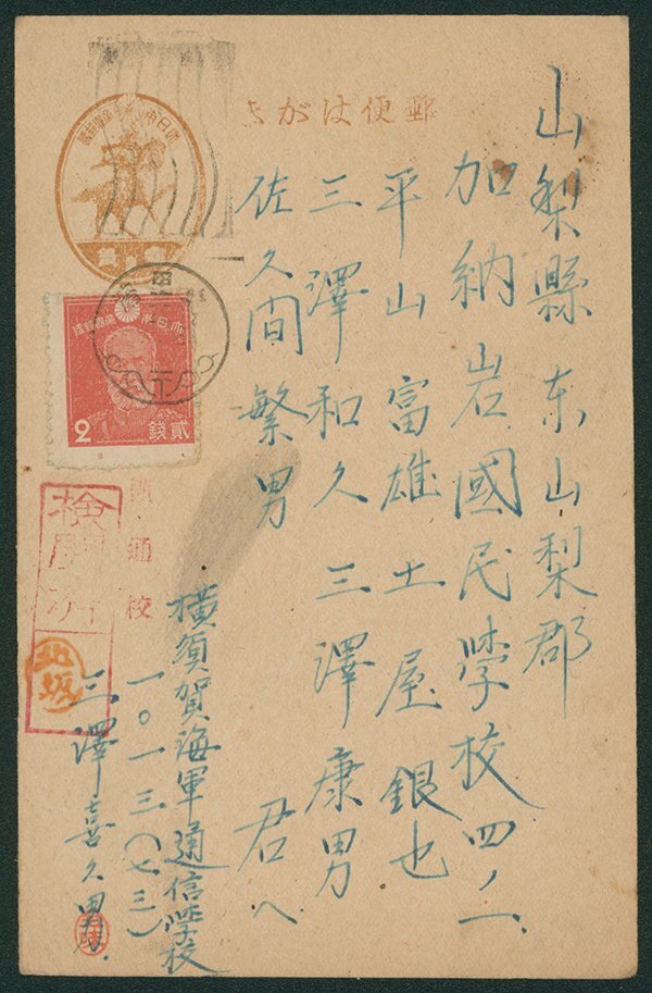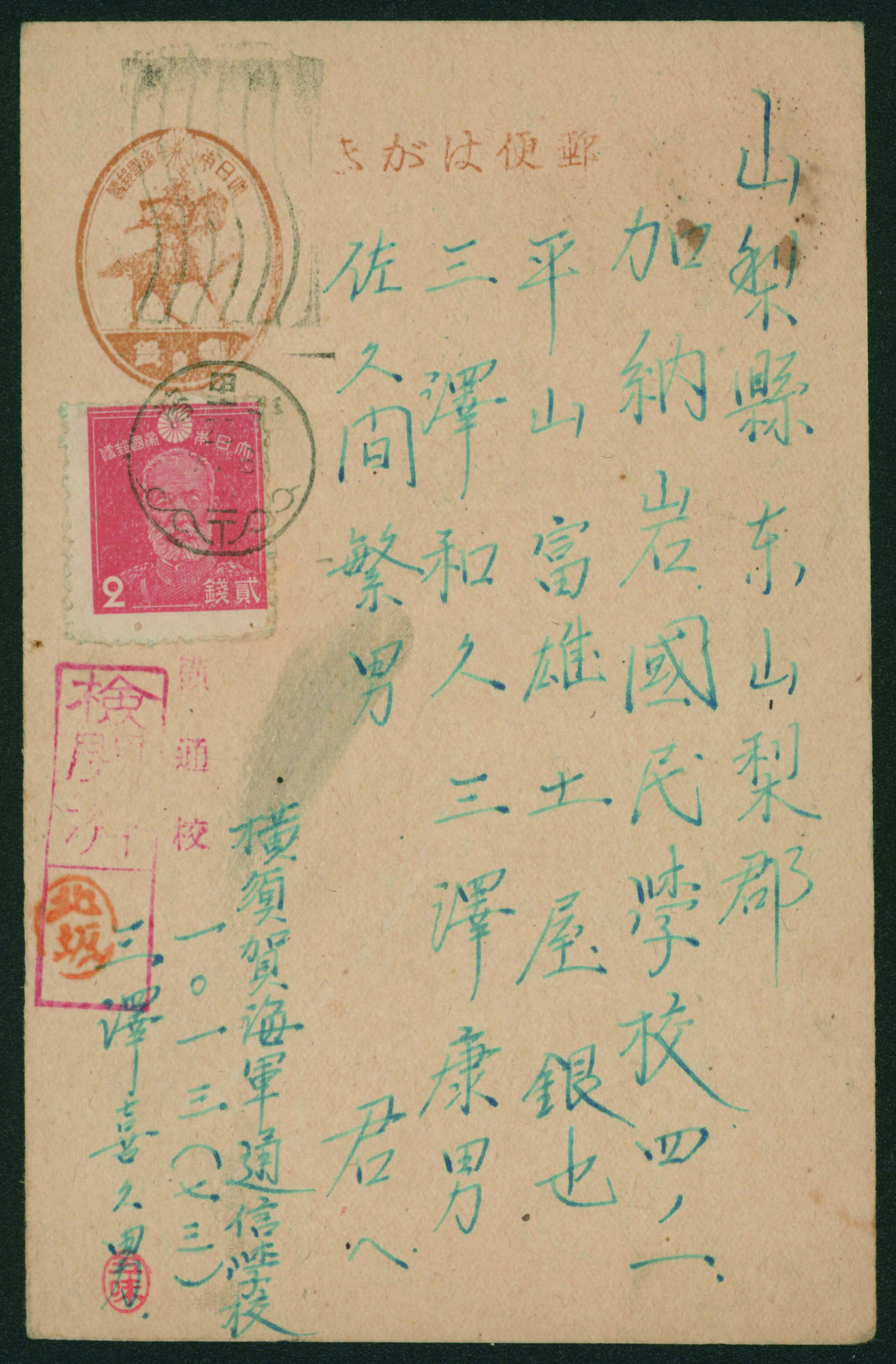 商品説明: 楠公3銭葉書, 乃木2銭 L12 唐草機械印 久里浜→山梨 葉書 検閲あり 横須賀海軍通信学校発JPS PC38,223