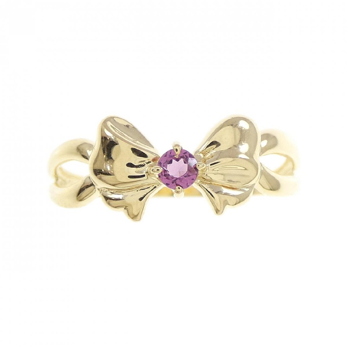 明るいピンクカラーのガーネットをセッティング。リボンのモチーフが可愛らしく指元を飾るリングです。