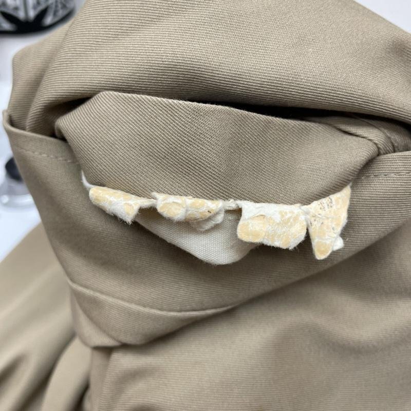 全体に汚れ。裏地にシミ。首周りに文字。ポケット内タグに劣化。