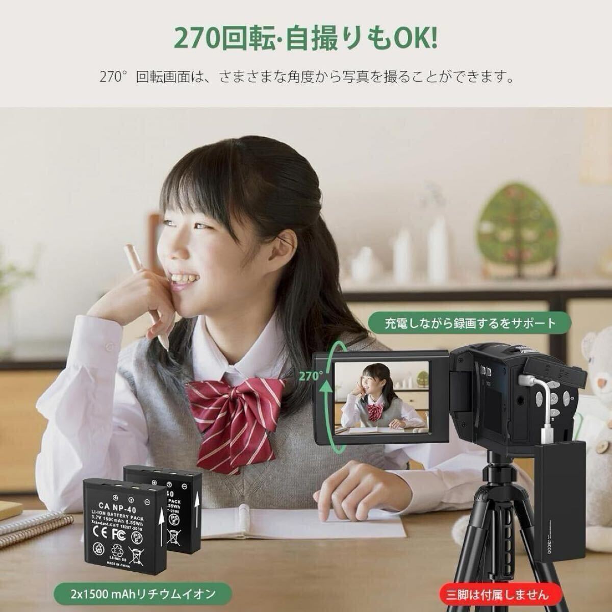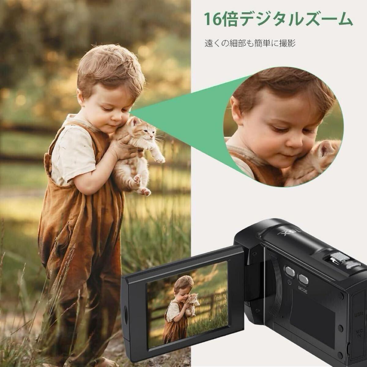 【2.8インチ液晶スクリーン&16X デジタル ズーム】ビデオカメラは2.8インチ液晶画面(4:3)を搭載し、鮮明で繊細な画面プレビューと操作ガイドインタフェースを提供し、撮影を簡単に制御することができます。270度回転することもできるので、自分撮りをしたいときにも便利です。16X デジタルズームを搭載し、W/T ボタンで画像を拡大または縮小することができます。重要な詳細をキャプチャし、遠くの物体をより鮮明に表示するために拡大で、 ビデオ愛好家にとって理想的な選択肢です。