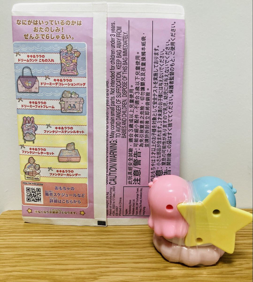 2023年製のキキララおもちゃは、6種類の中からランダムで入っているので、画像2枚目をご覧になり、お品の裏側に6種類が記載されているので、その中のどれかが1つ入っています。未開封のため、中は分かりません。