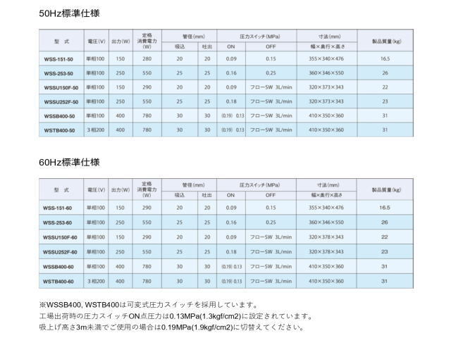 | 商品仕様 | 型式:WSS-253-60 電圧:西日本60Hz仕様 周波数:60Hz 吸込口径:25A 吐出口径:25A 質量(Kp):26 駆動方式:単相100V 出力(W):250 流体:清水 温度:常温 配管との接続:ねじ込み 発売元:岩谷電気製作所 ※商品画像は代表機種を掲載しております。 お届けの機種とは異なる場合があります。 |