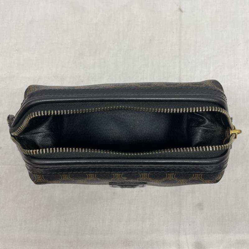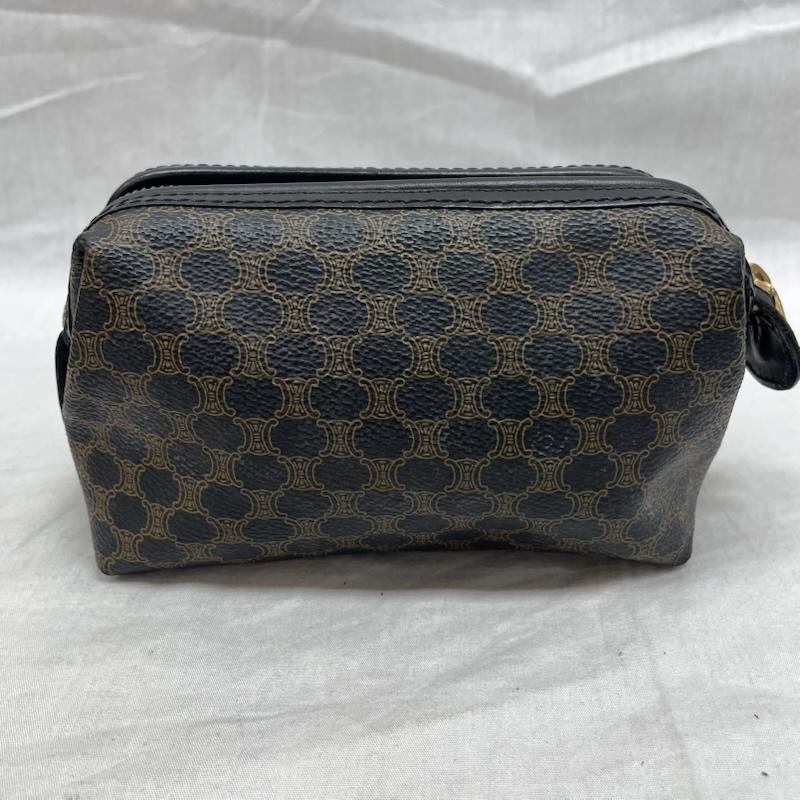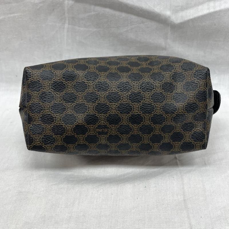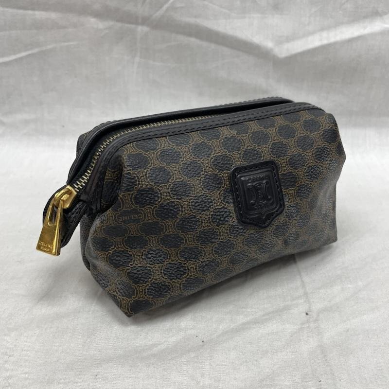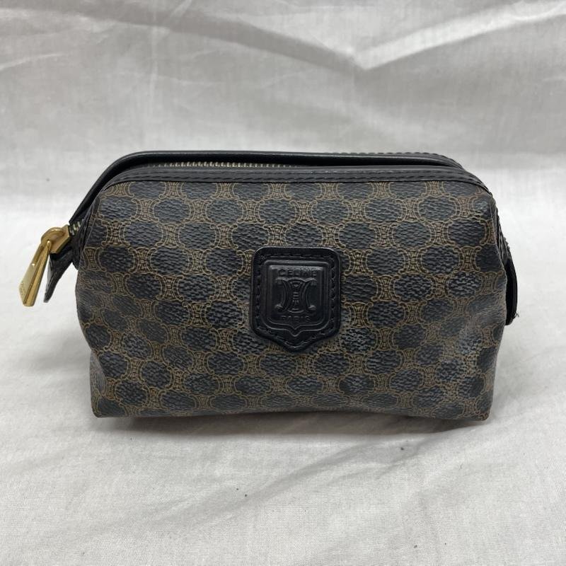 セリーヌ マカダム柄 PVC BRW 総柄 化粧ポーチ オールレザー ゴールド金具 -