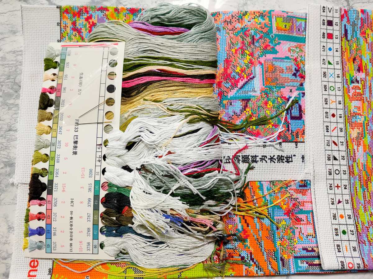 刺繍糸は余分に見積もって入っていますが、製作中もし足りなくなった場合は、ご自身でご用意ください。DMCの糸番号に対応しています。検品のため1度開封しています。