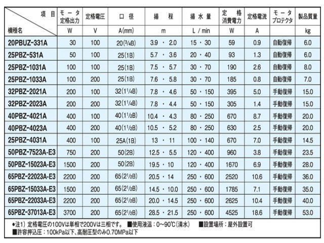 | 商品仕様 | 型式:20PBUZ-331A ユニオン接続 電圧:東日本仕様 50Hz仕様 口径:20A(3/4B) 最大揚程:3.9/2.0m 最大揚水量:15/30Lmin 定格出力:30W 消費電力:59W 電圧:単相100V 質量:6.0kg 設置場所:屋外設置用 ※商品画像は代表機種を掲載しております。 お届けの機種とは異なる場合があります。 |