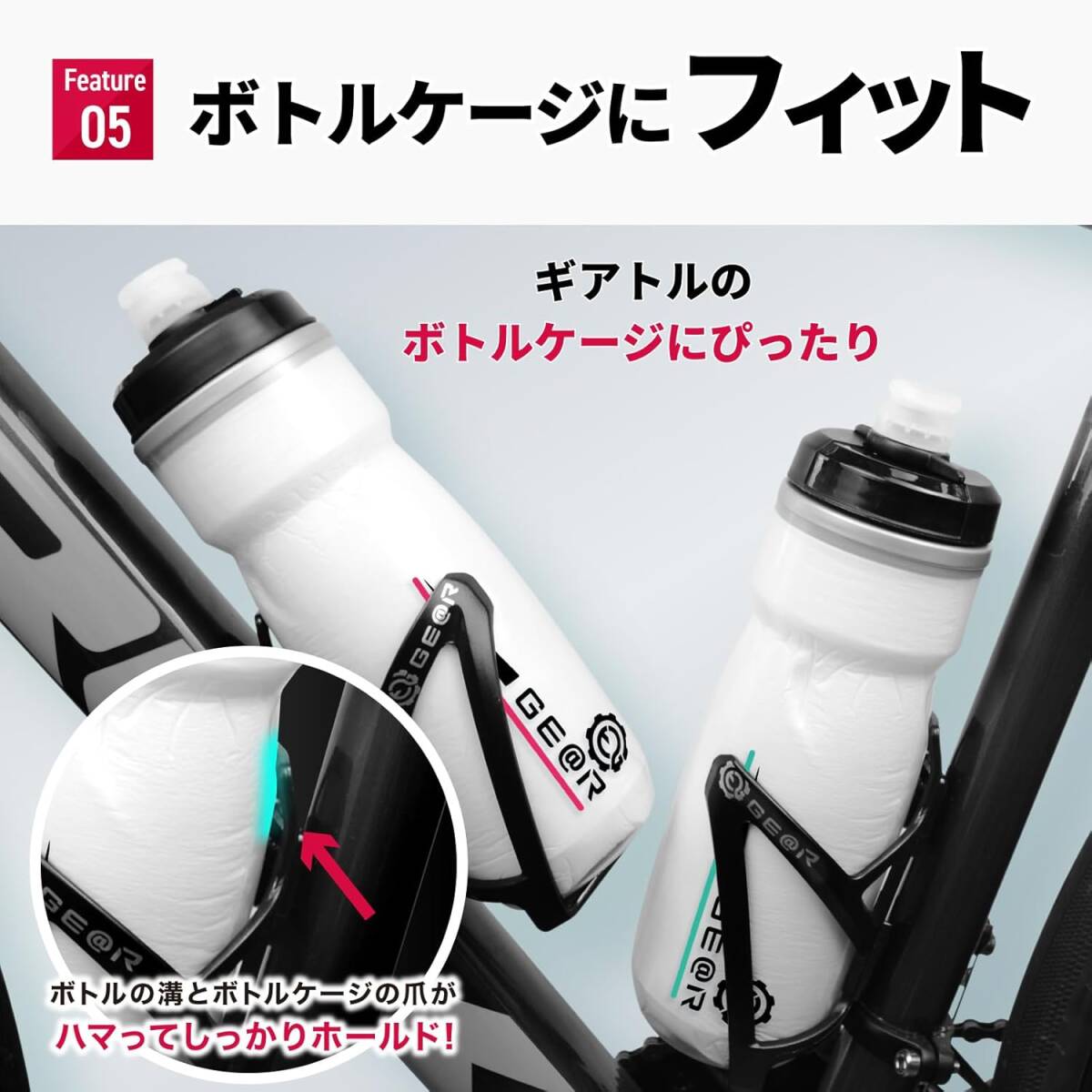 • このおしゃれなボトルは、サイクリングに必要なアクセサリーとして完璧な選択です。ボトルケージやペットボトルホルダーにぴったり収まるデザインで、有名ブランドボトルケージとも相性抜群です。自転車用ボトルとして、水筒やスポーツボトルとしてもお使いいただけます。