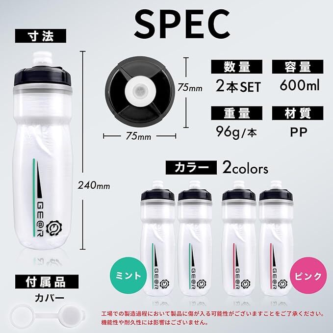 • 【SPEC】このサイクルボトルのサイズは240*75*75mm、重量は約96gです。素材はPPで、安全性は国の指定検査機関で確認されています。カラーは2種類から選べます。