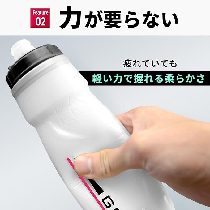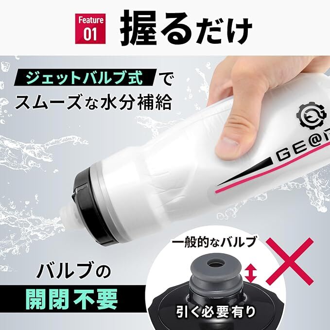• 【ジェットバルブ】自転車用ボトルには、握るだけで水が出るジェットバルブ式を採用しています。走行に集中しながらでも、口を付けずに簡単に水分補給が可能で衛生的です。さらに、この機能によりスポーツボトルとしての利便性も高まっています。