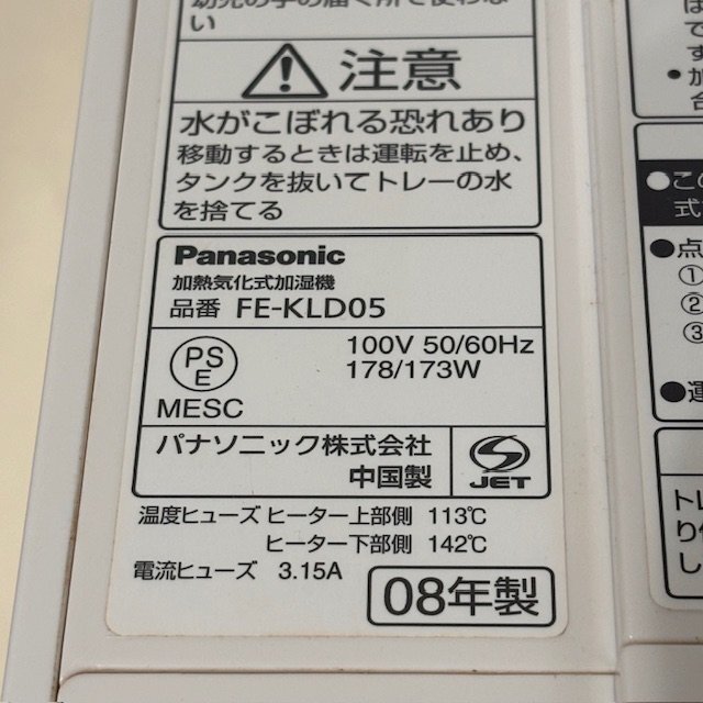 Panasonic パナソニック 加熱気化式加湿機 FE-KLD05-P 2008年製 タンク容量4L 家電 乾燥対策 27~37dB ホワイト |