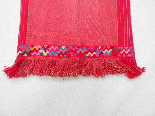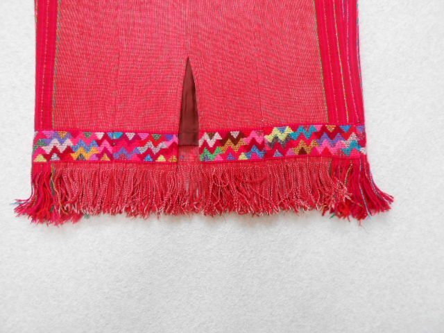 裾にはカラフルな幾何学模様のテープとフリンジを施し、エスニック&ボヘミアンな雰囲気に仕上がっています。