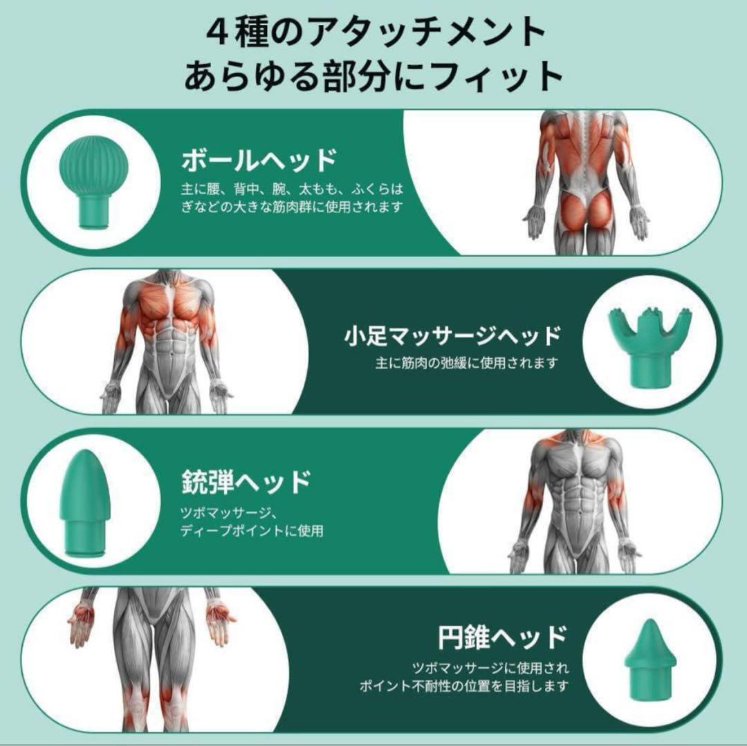 4種のアタッチメントを付け替えて使用することで、全身ケアが可能に。足首や足の裏なども、ピンポイントで刺激することができます。