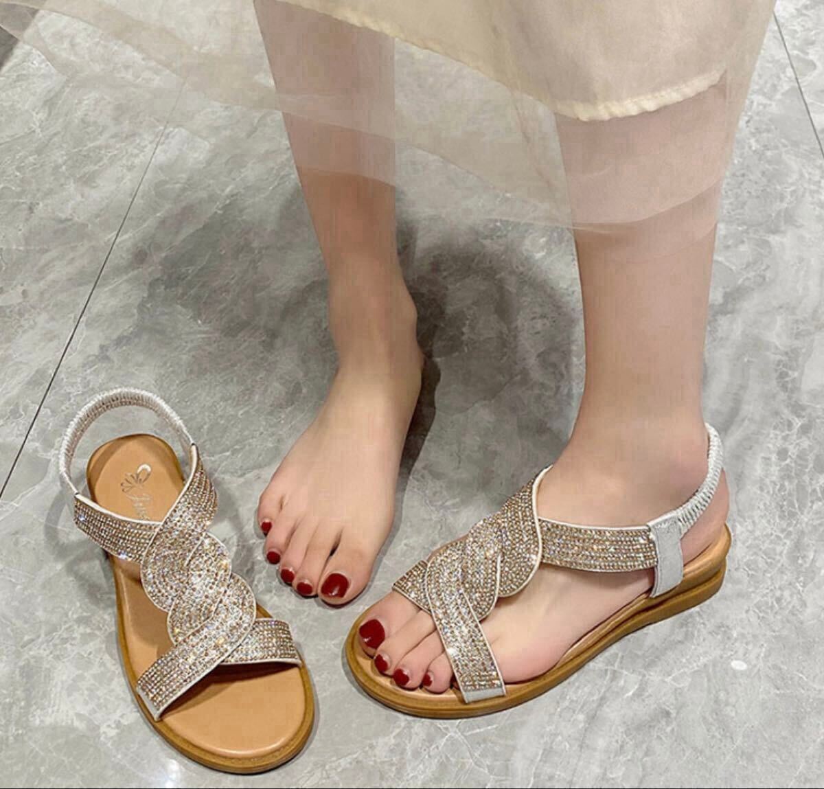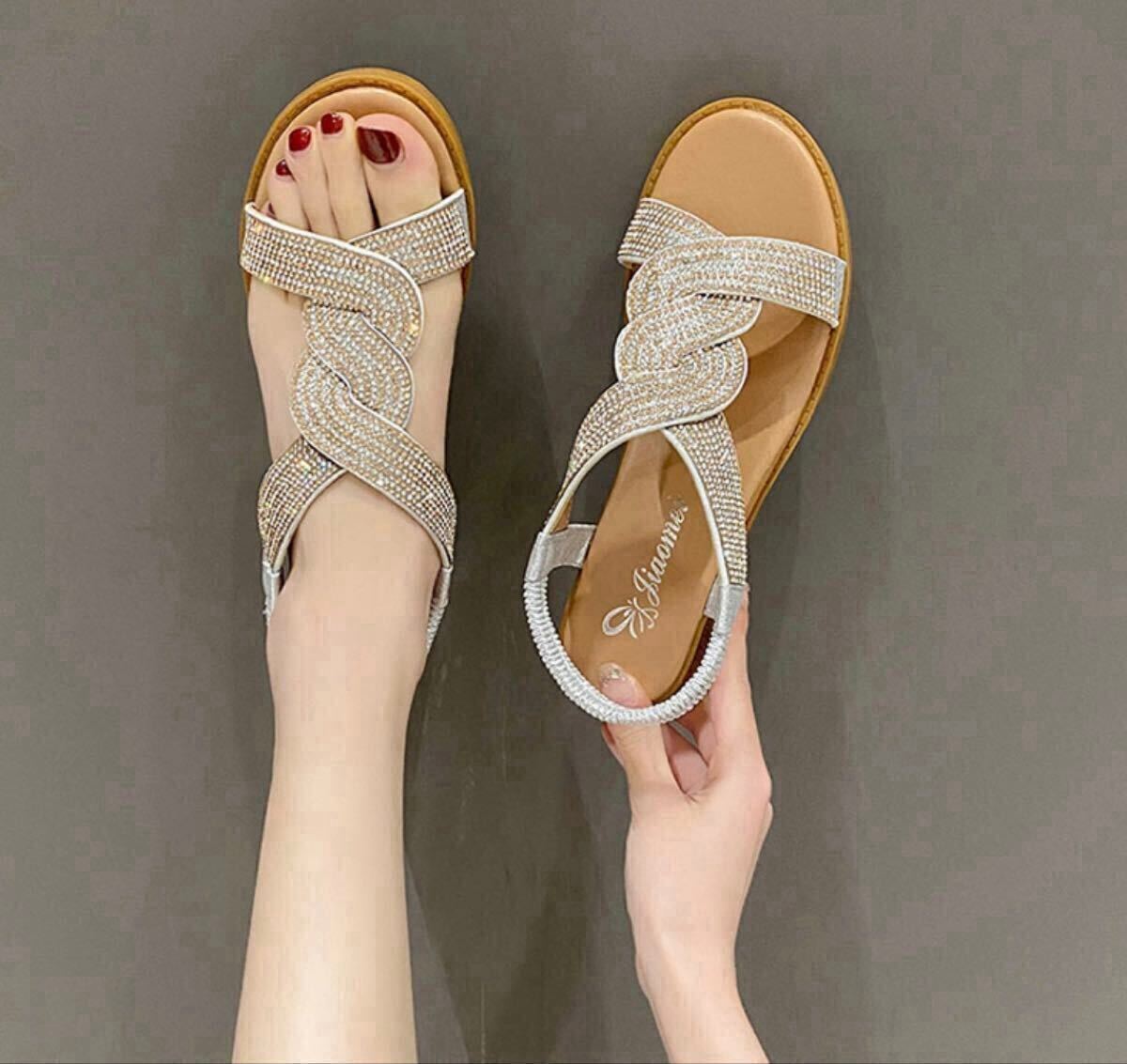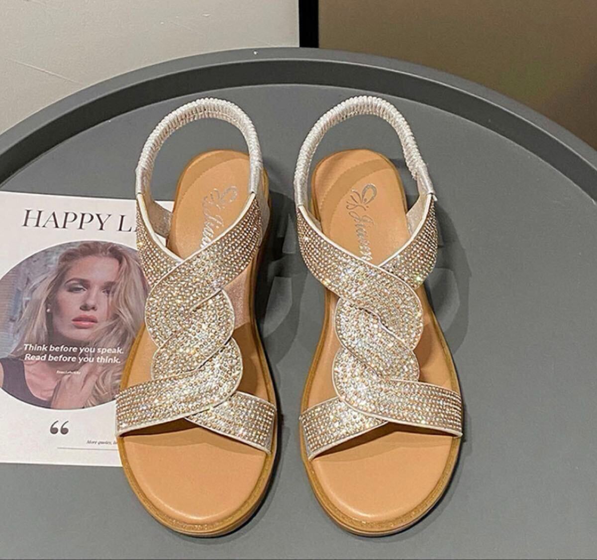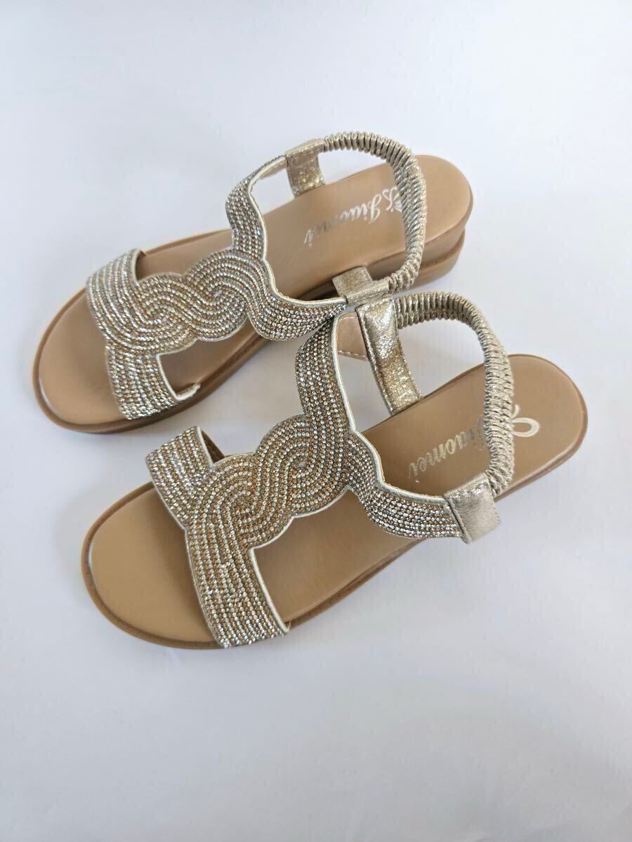 足元を華やかに彩る、ゴールドカラーのサンダルです。