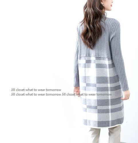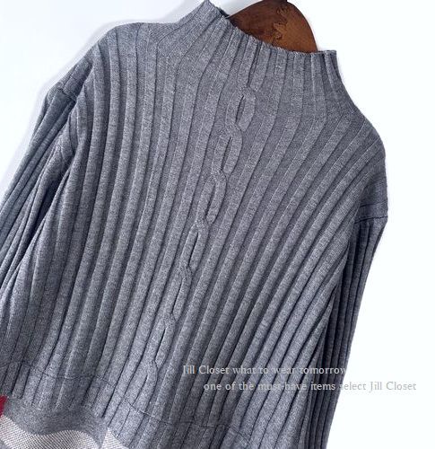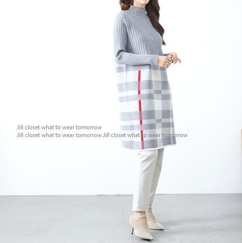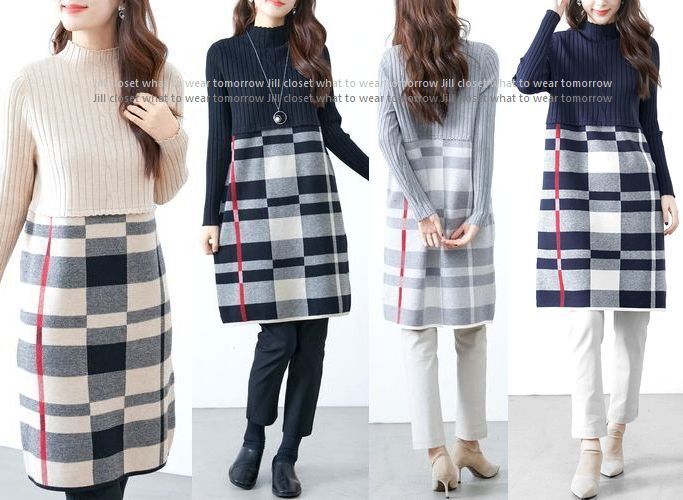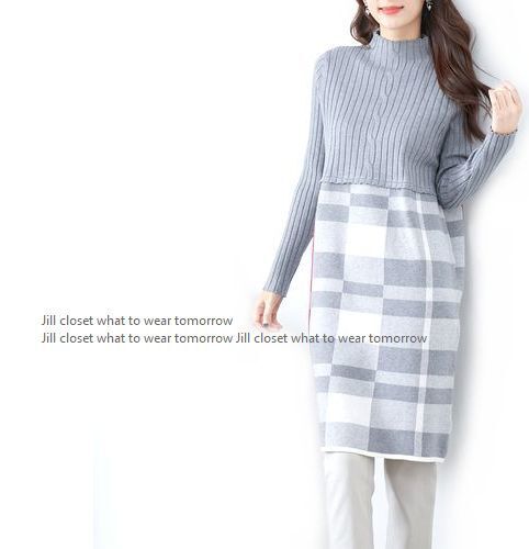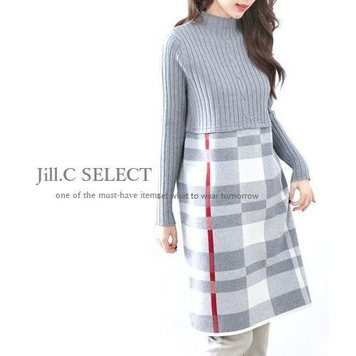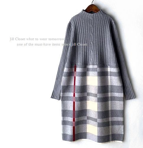 新品【送料185円】GRAY*リブ×ハイゲージニット チェック柄切り替えdesign*ハイネック*プルオーバー*チュニック*ワンピース7400