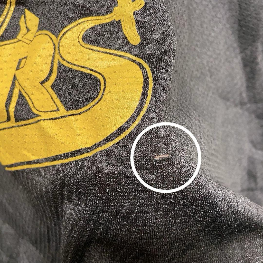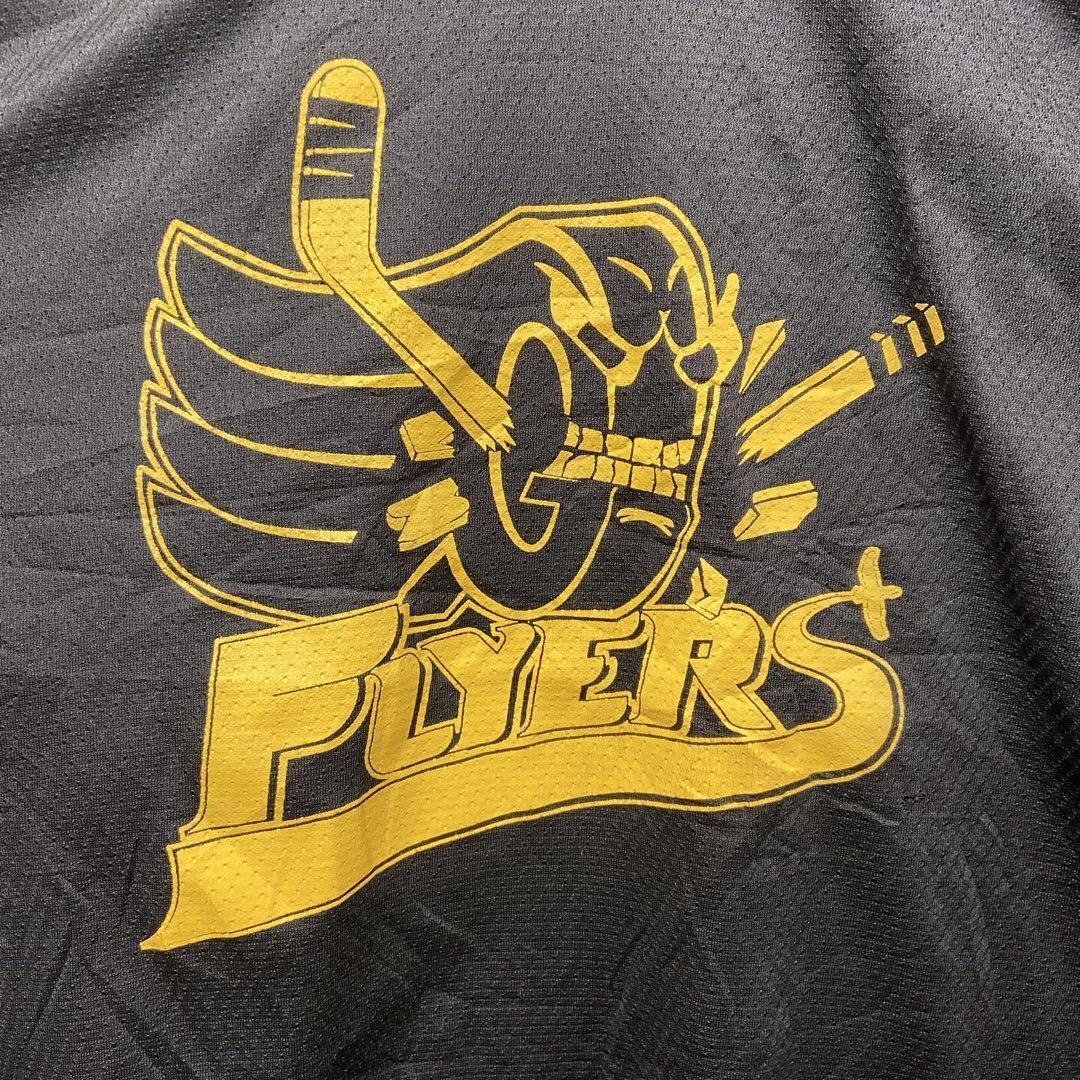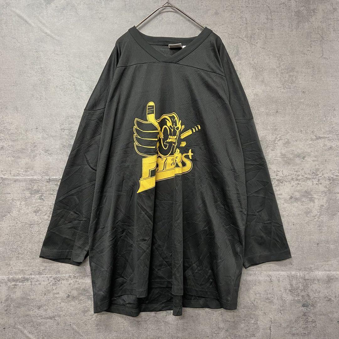 USA古着カマズのホッケーシャツです。ブラックボディにイエローの「FLYERS」プリント入りで、スポーツファンやストリートスタイルにおすすめの一着。生地に小さなダメージがあるため古着慣れした方におすすめです。