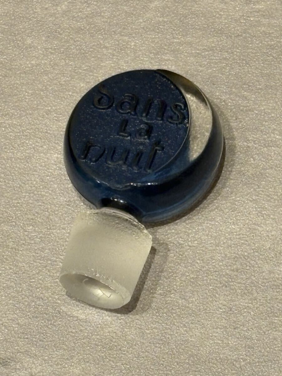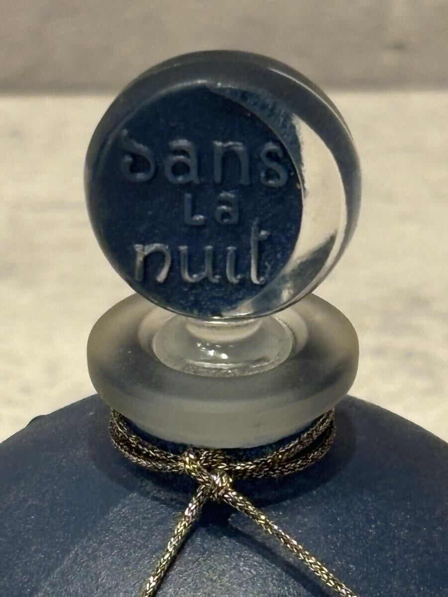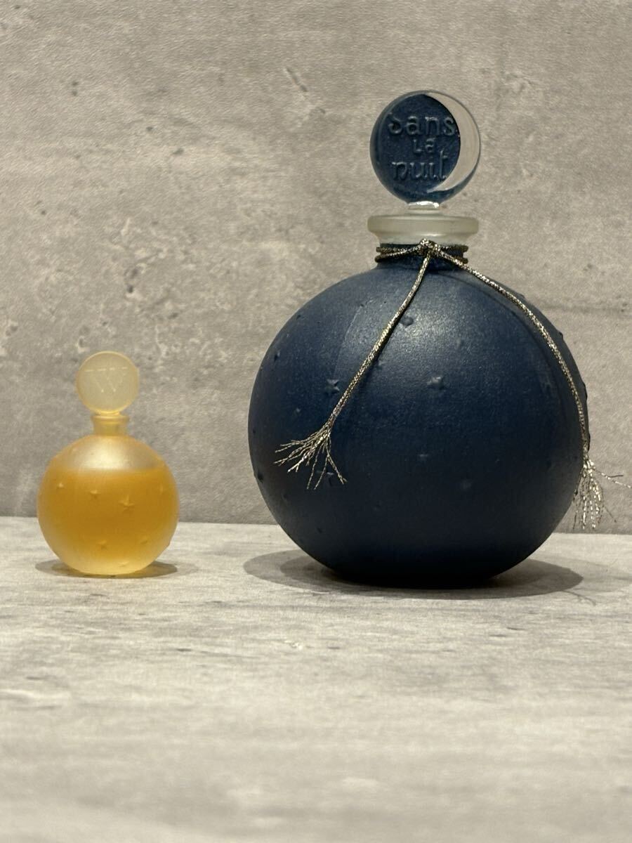 深いコバルトブルーのサテン仕上げガラスに、夜空を思わせる星のレリーフを散りばめ、ストッパーには作品名「Dans la Nuit」と三日月を象った名品です。