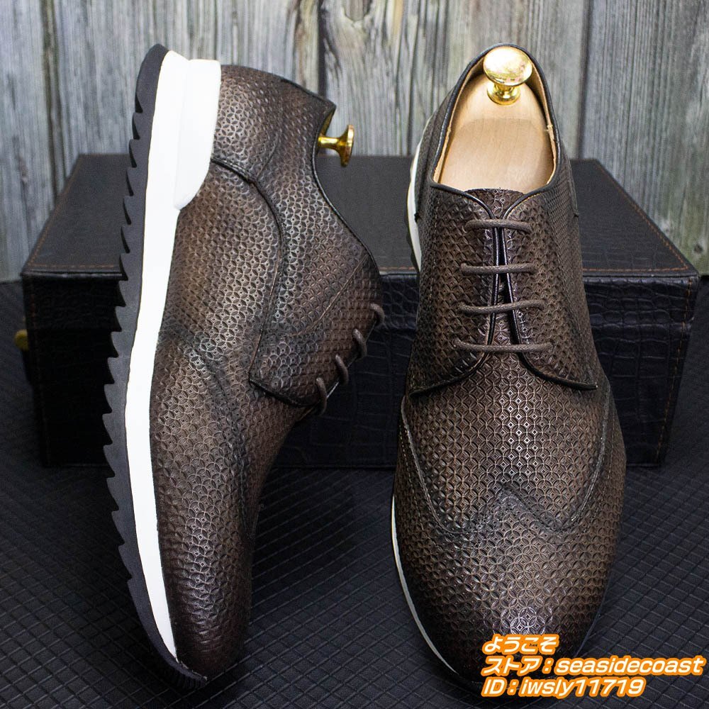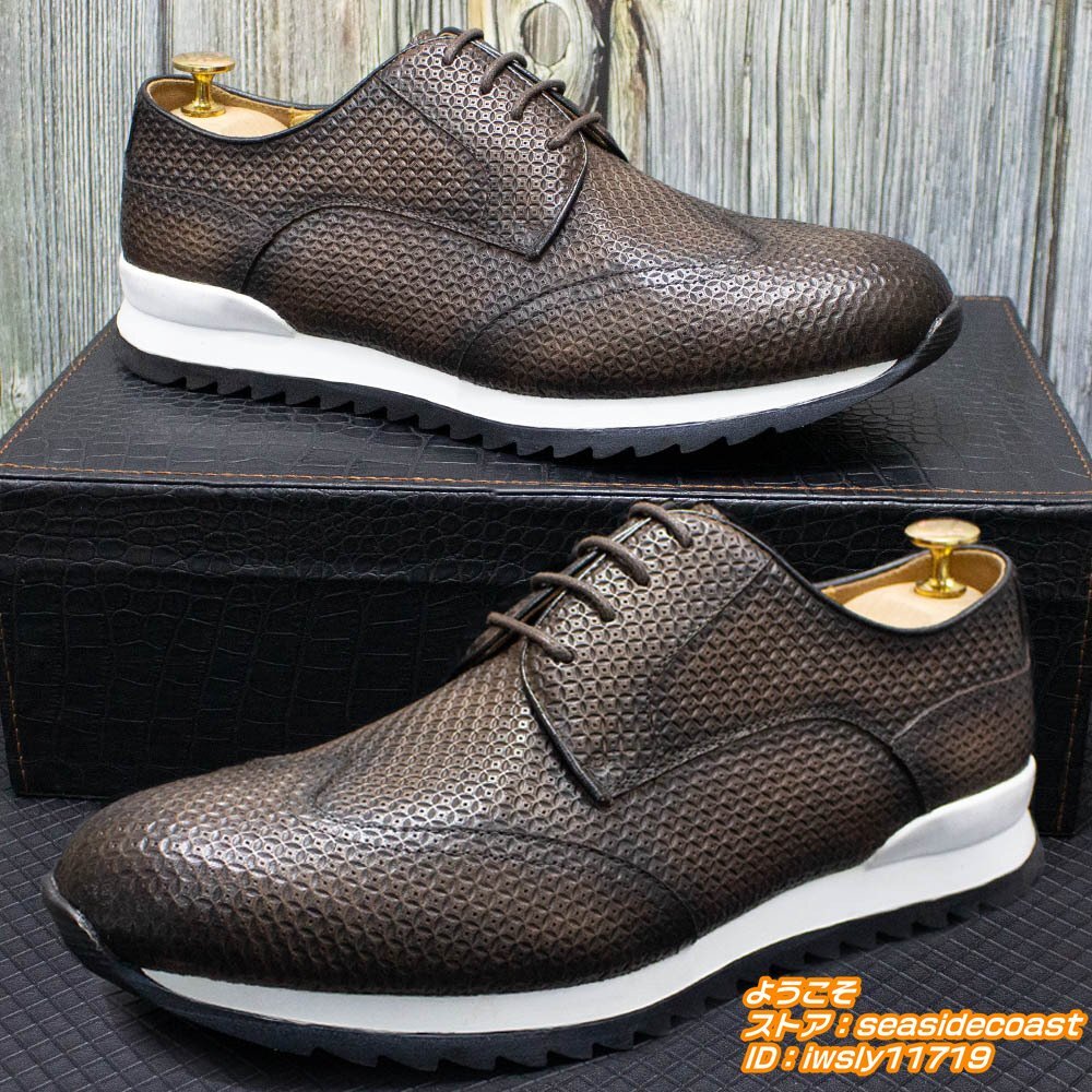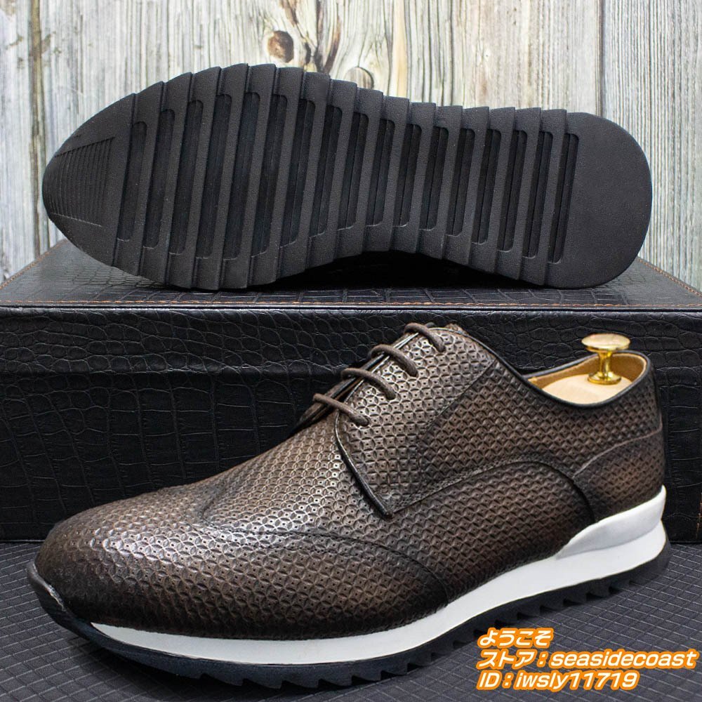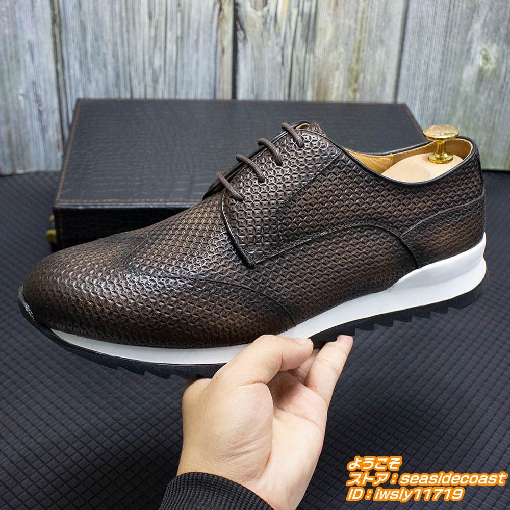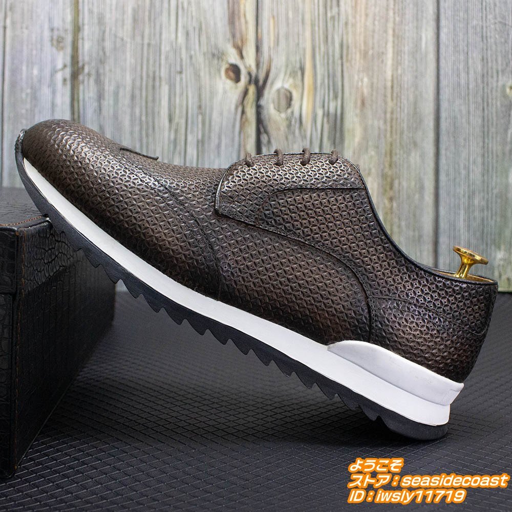 極美品*定価9万 スニーカー メンズ 本革 レザーシューズ 職人手作り ビジネスシューズ 牛革 ローファー スリッポン 押し柄 珈琲色 28.0cm