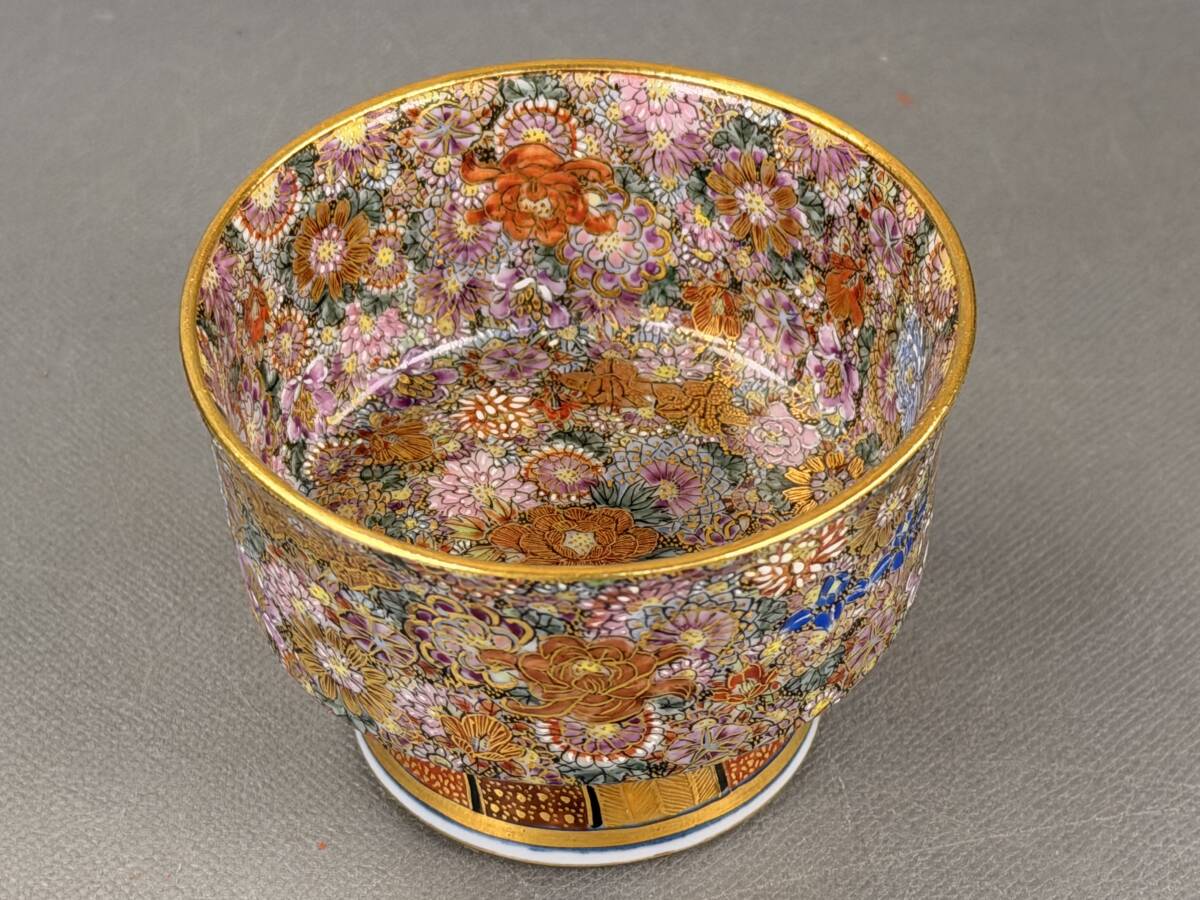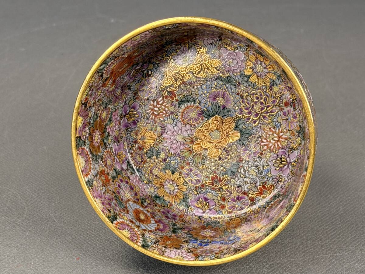 【偲】九谷 栄山 八十翁 金城 酒杯 盃 花詰 色絵 金襴花図 茶道具 茶器 金襴手 高さ約5.3㌢ 共箱 c-244