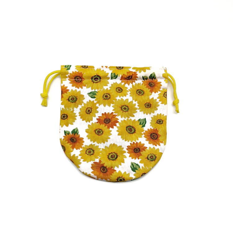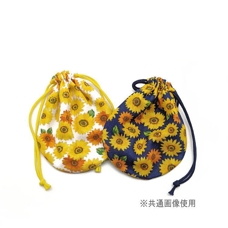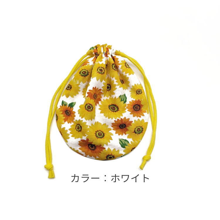 丸型巾着袋・SS袋【ダブルガーゼ生地 ヒマワリ柄 ホワイト】裏地つき マチ無し 両絞り Wガーゼ 日本製 巾着 ポーチ 花 向日葵 ひまわり