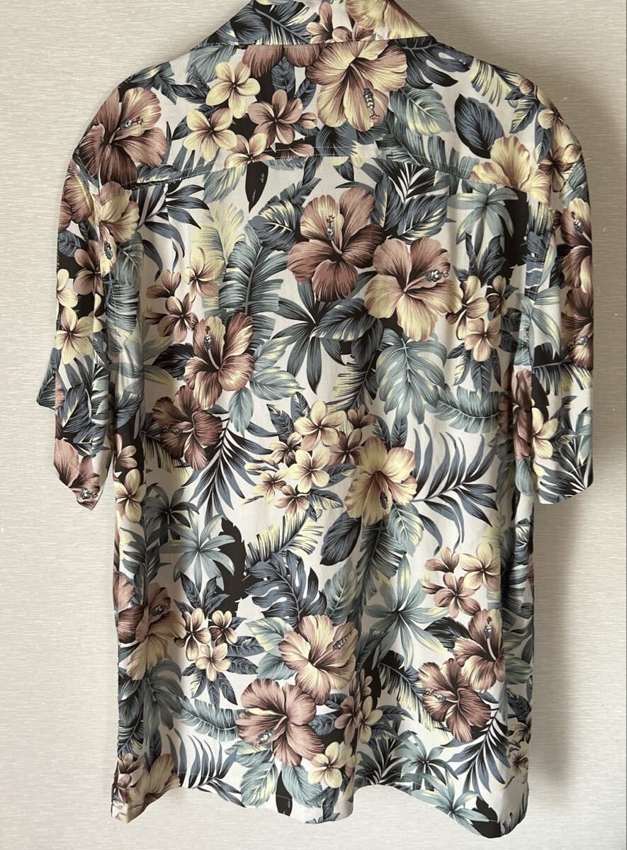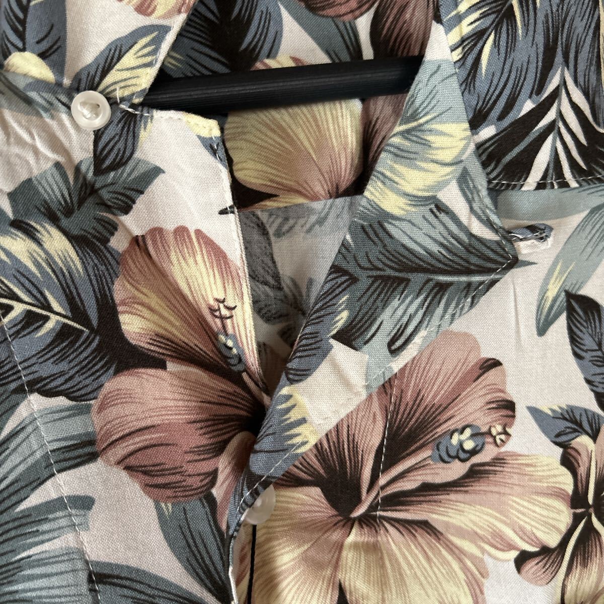 少し厚めのレーヨン素材に、渋めのハイビスカス ボタニカル総柄になります。