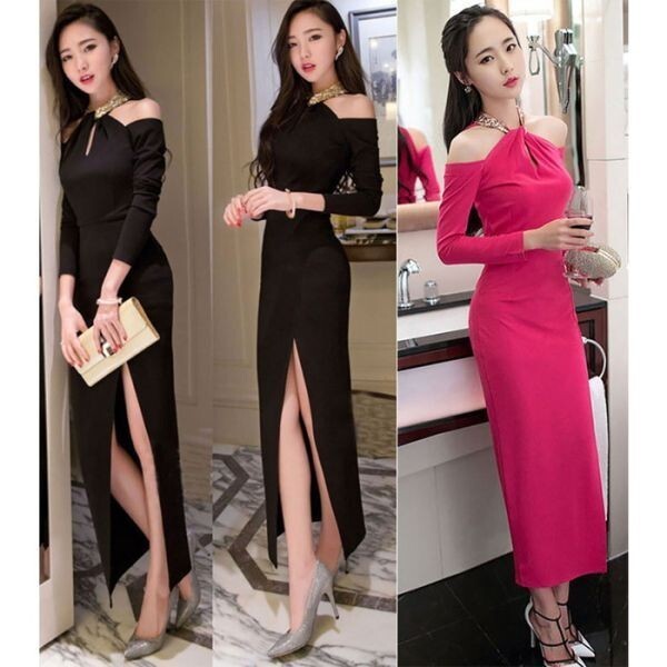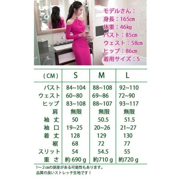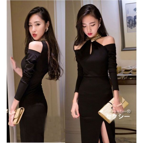 ナイトドレス ロングスリーブ キラキラハイネック ストレッチ性生地 ハイスリット ロング丈 Sライン レディース ブラック S