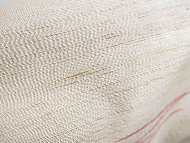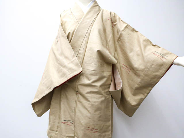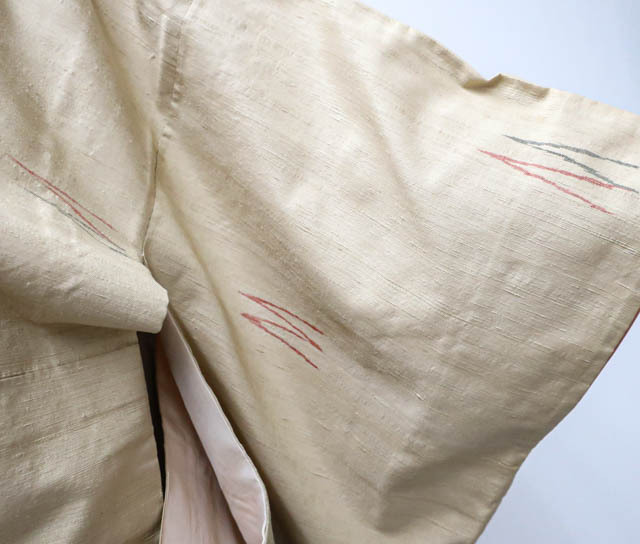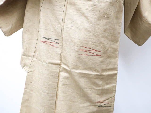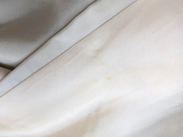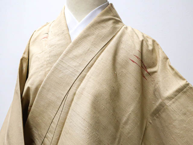 リサイクル商品のため、衿汚れと衿裏に薄しみがございます。 右前袖にしみと所々汚れがございますが着用可能なお品です。 地色はベージュ です。 1枚目の画像が近いお色かと思われます。 素材は正絹です。 |