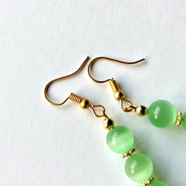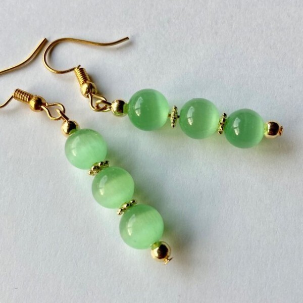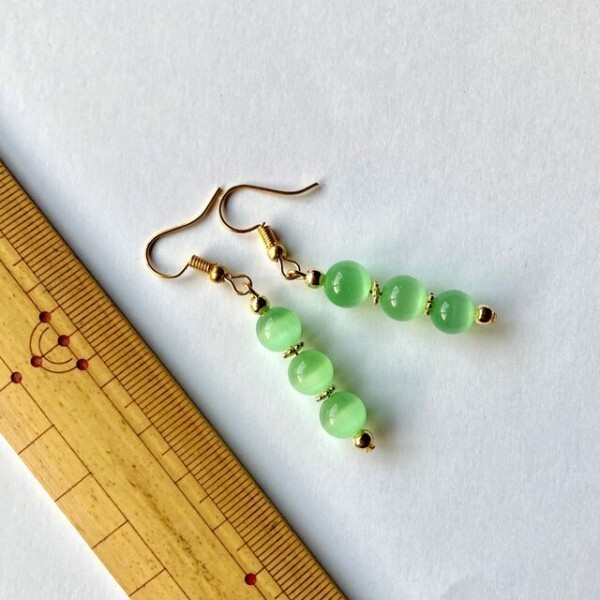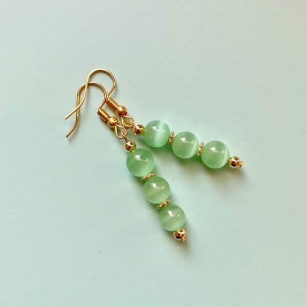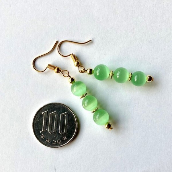こちらは、8mm玉のキャッツアイを3個並べたフックピアスです。女性の可愛らしさを引き立ててくれるピアスになっております。シンプルなデザインですのでコーディネートにも合わせやすいデザインで、使い勝手がいいアイテムとなっております。