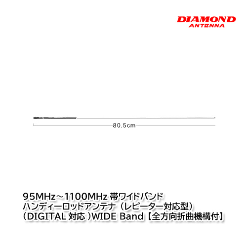 第一電波工業(ダイヤモンドアンテナ)SRH789 95MHz~1100MHz帯ワイドバンドハンディーロッドアンテナ(レピーター対応型)(DIGITAL対応) WIDE Band【全方向折曲機構付】RoHS ● 価格 : 3,300円(税込)3,000円(税別) ● 全長 : 80.5cm (フルサイズ)、20cm(最短サイズ) ● ロッド段数 : 6段 ● 重量 : 29g ● 利得 : 2.15dBi(95~300MHz)、3.2dBi(300~1100MHz) ● 耐入力 : 10W FM ● インピーダンス : 50Ω ● 接栓 : SMA-P ● 形式 : 1/4λ(95~300MHz)、5/8λ(300~1100MHz)、全方向折曲機構付 ● AM/FM受信対応(エレメントフルサイズ時) ● 空中線型式 : 単一型 |