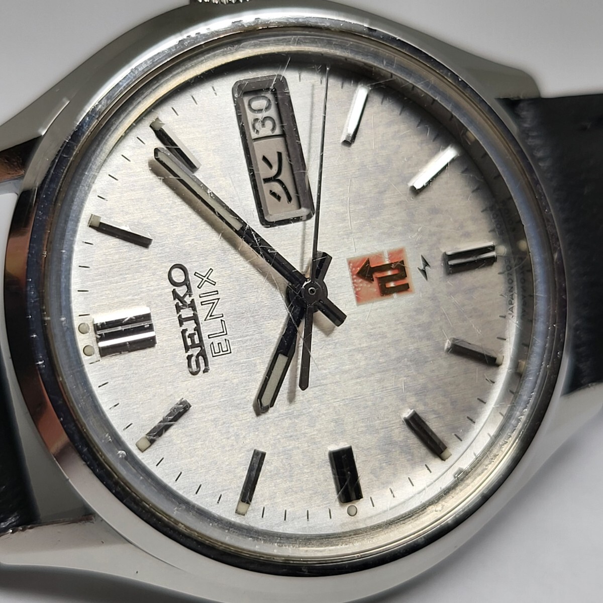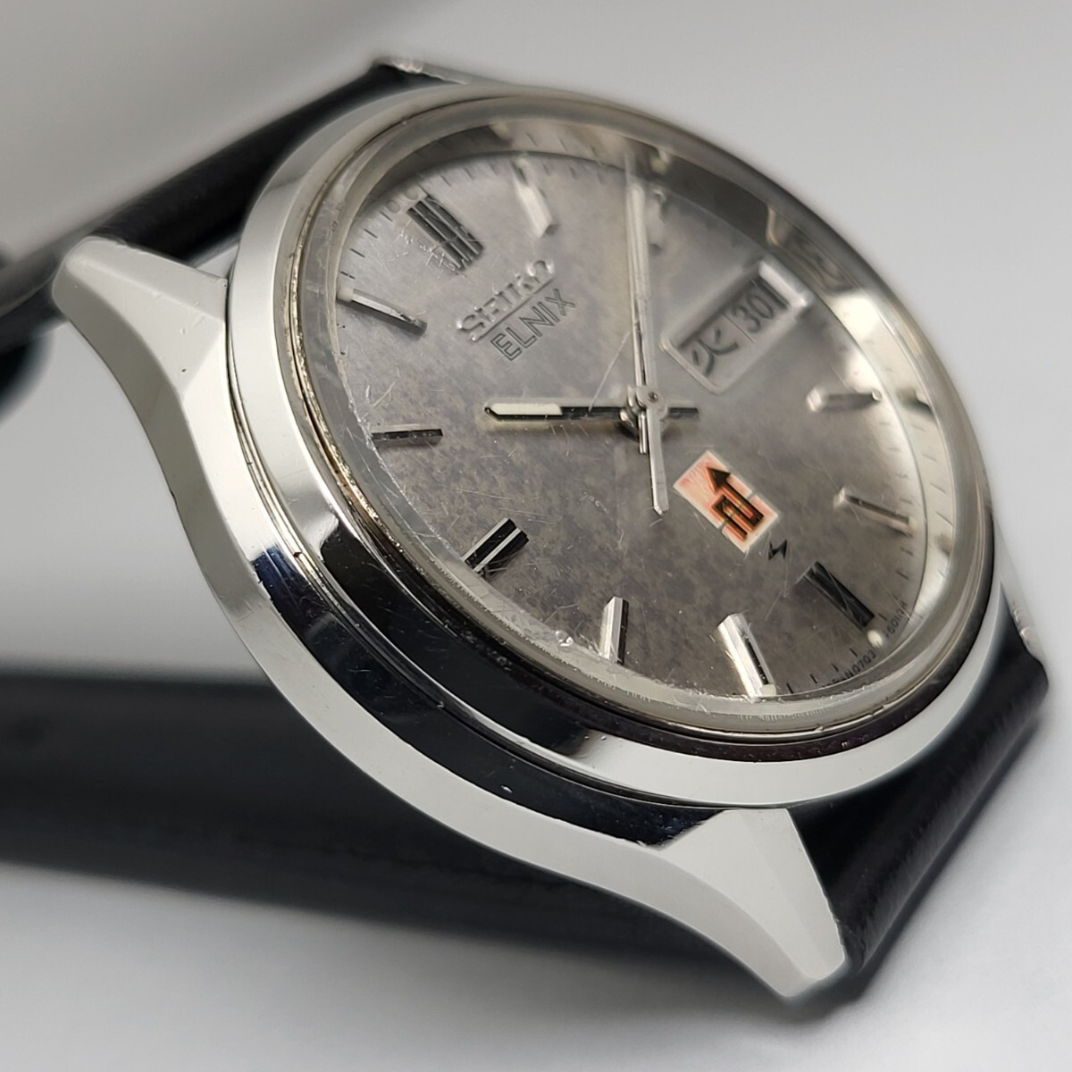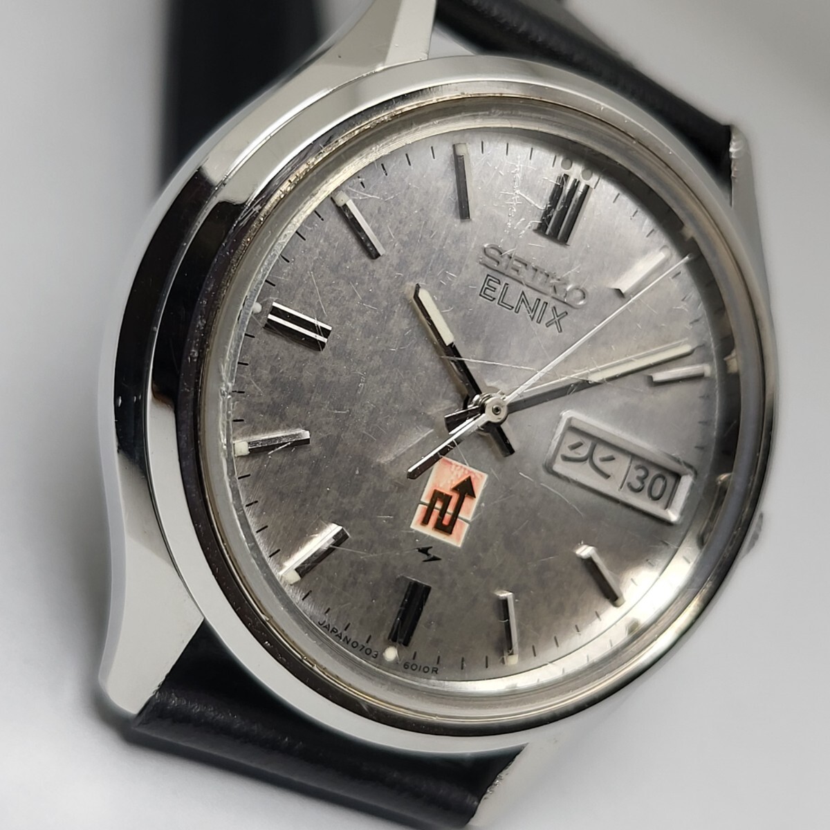 セイコーのエルニクスです。 電池を動力に機械式の構造で時を刻む電子テンプ式。SEIKOの電子テンプ式機械にも幾つかの種類がありましたが、エルニクスは最晩期メカです。 それ以降はクオーツ時代へ一気に突入しました。 70年代テイストが、ただよいます。 矢印マークはエルニクスのモデルロゴのようです。