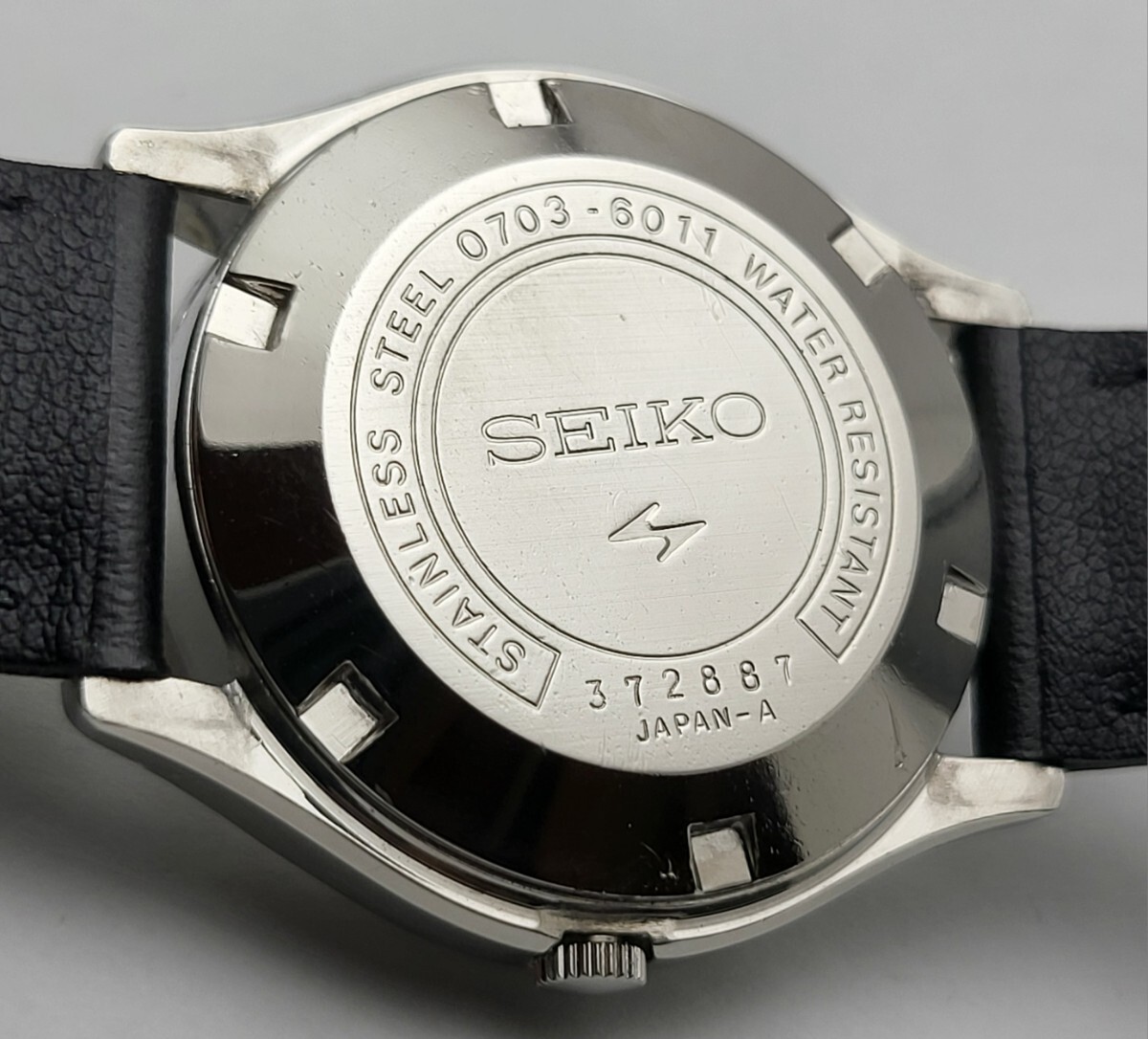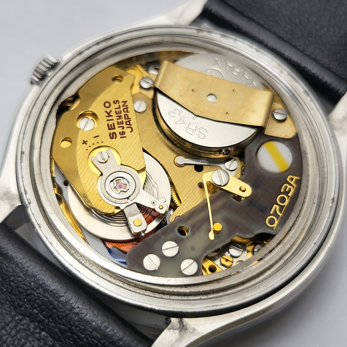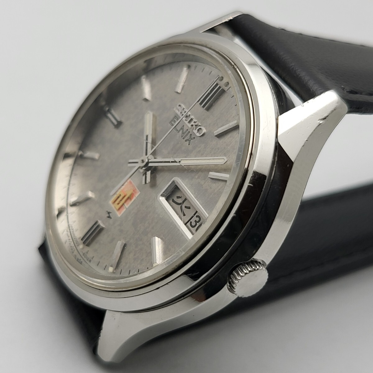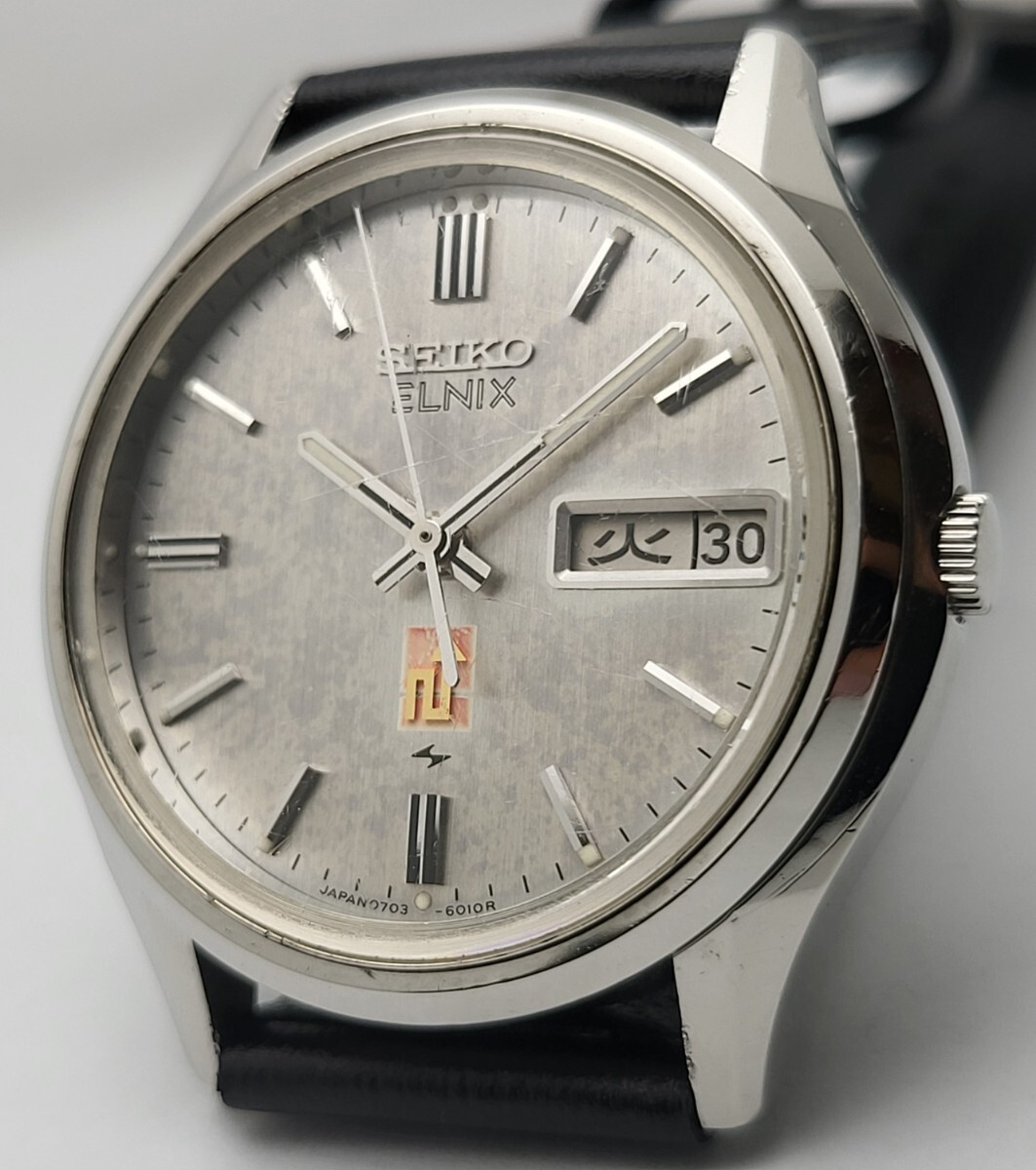 セイコーのエルニクスです。 電池を動力に機械式の構造で時を刻む電子テンプ式。SEIKOの電子テンプ式機械にも幾つかの種類がありましたが、エルニクスは最晩期メカです。 それ以降はクオーツ時代へ一気に突入しました。 70年代テイストが、ただよいます。 矢印マークはエルニクスのモデルロゴのようです。