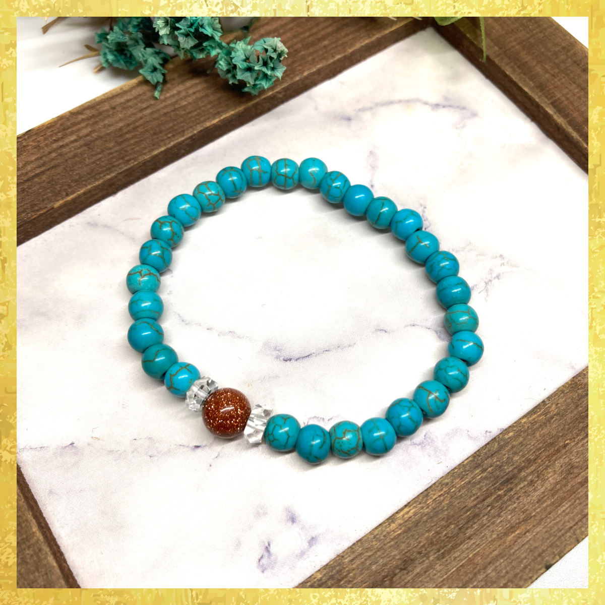 こちらは、ゴールドストーンとターコイズを組み合わせた一粒ブレスレットです。今回はお買い得プライスにて販売しておりますので是非この機会にどうぞ。(お買い得プライスは予告なく終了する場合がありますのでお早めに!!) 石大きさ8mmと6mm玉で基本サイズは内周15cmです。(サイズ変更は1cmあたり100円で承っております。サイズ変更の場合は金額変更しますのでご連絡くださいませ。)