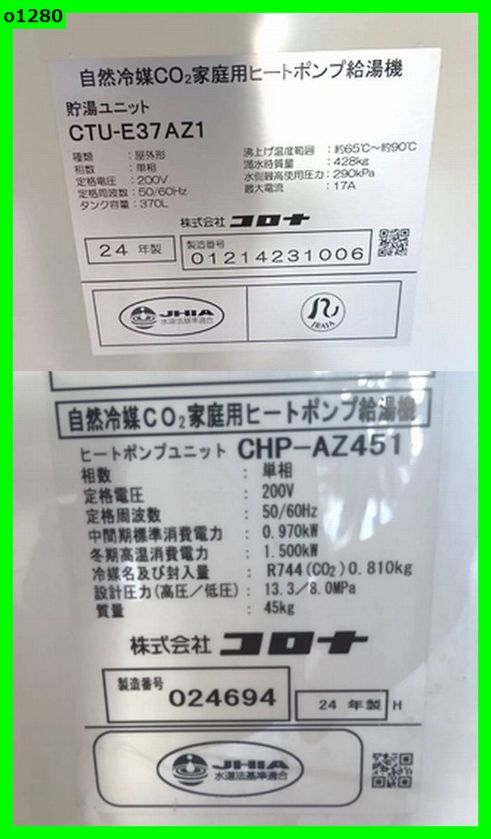 ■型番・メーカー■ CHP-AZ451・CTU-E37AZ1・コロナ ■電源・年式■ 単相200V・2024年製 ■商品詳細■ 3階でもパワフルシャワー、お湯はりもスピーディ。 インターホンリモコンセット(RBP-GAD1(S)) (台所リモコン+浴室リモコン)付 一般地向け(-10℃対応) 貯湯量370L(3~5人用)、1缶式 ●高圧力パワフル給湯 ●入浴お知らせ機能(音声モニター付) ●省エネ保温 ●ふろ自動一時停止 ●節水モード(ふろ) 貯湯ユニット寸法: 高さ1860×幅630×奥行730mm ヒートポンプユニット寸法: 高さ720×幅884×奥行299mm ■注意箇所■ 来店引き取りか当店配達のみです。 ■動作確認■ 確認済み ■商品の状態■ 展示品で未使用 一度取付取外してます。 | ||