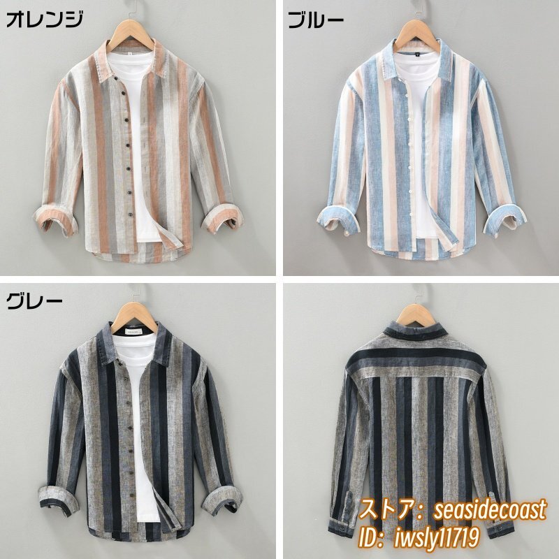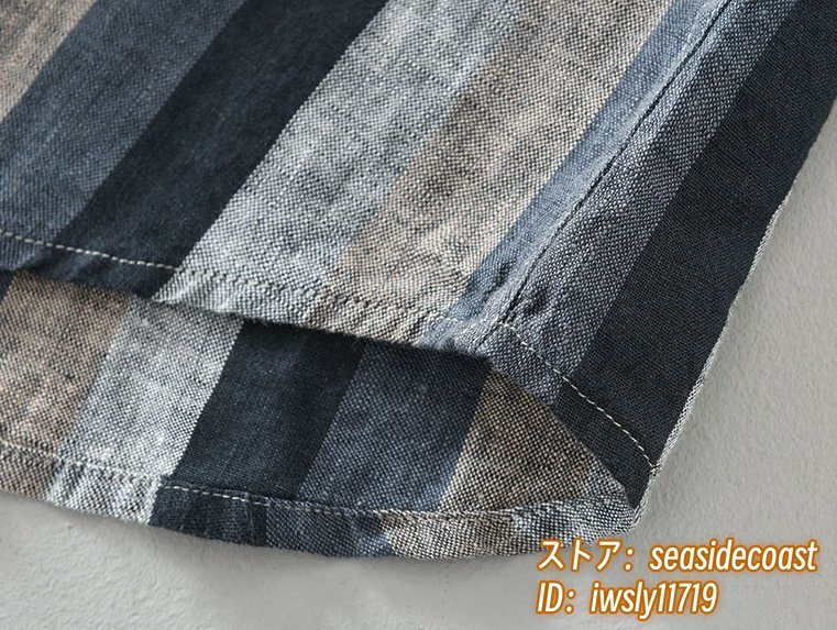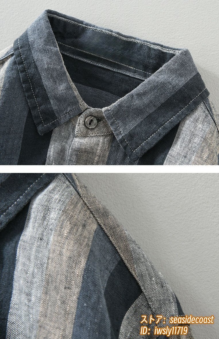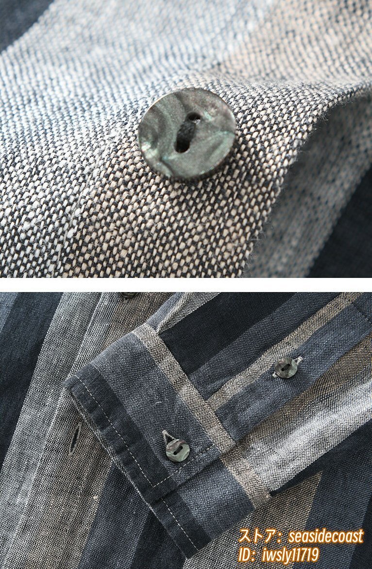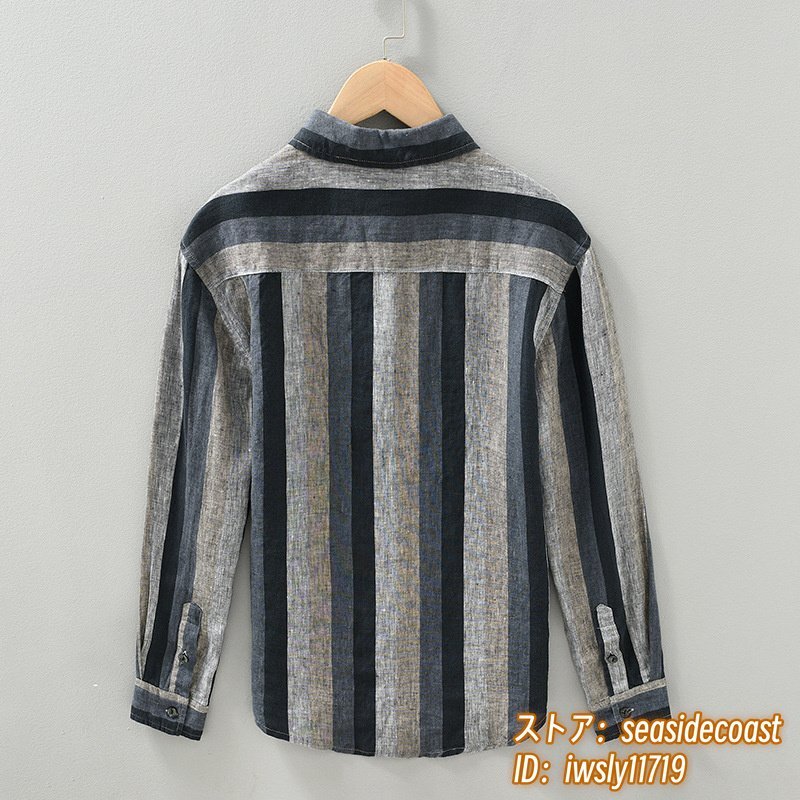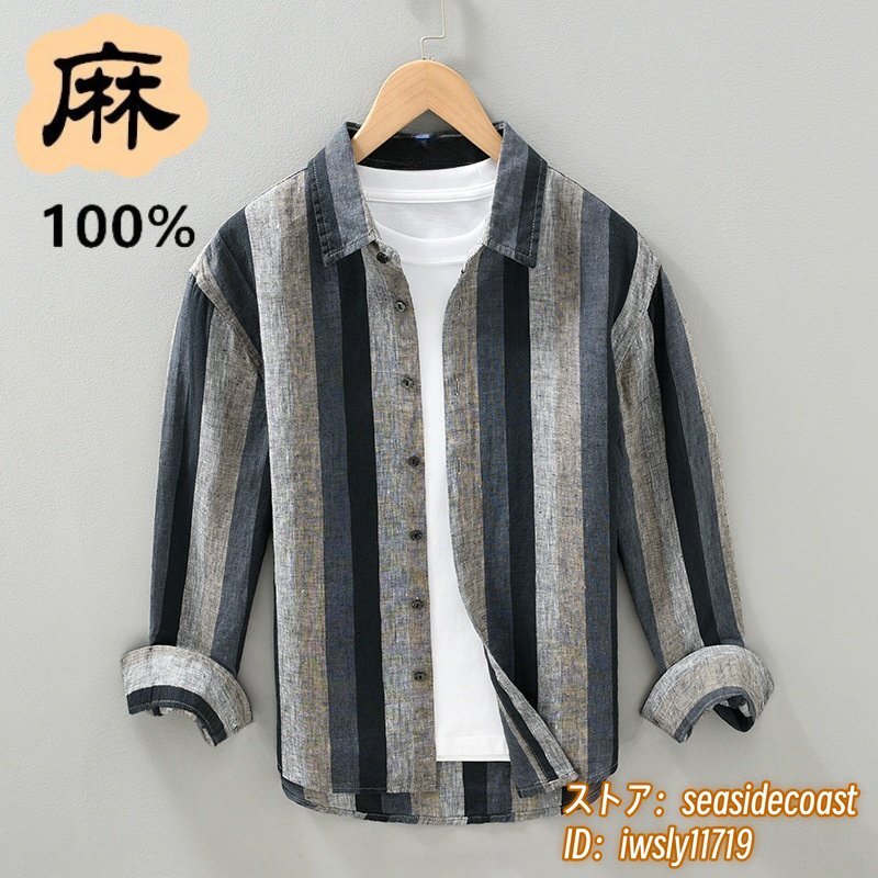 超美品■リネンシャツ 麻100% 長袖シャツ メンズシャツ 亜麻 ストライプ柄 アロハシャツ サマー 清涼感 麻シャツ 心地良し グレー 2XL