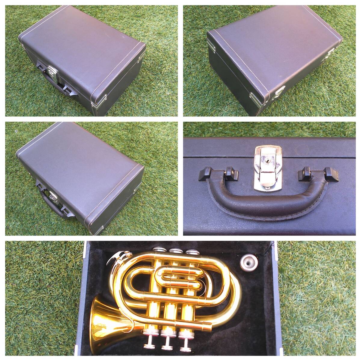 お送りするアイテムは、ポケットトランペット本体及びマウスピース、そしてケース(鍵は欠品)の三点です。