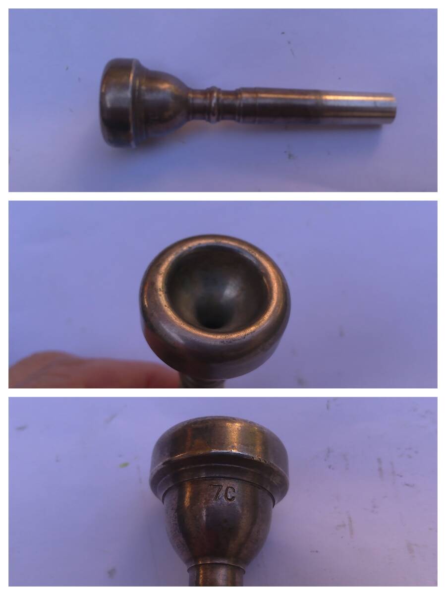 付属品は、写真のケース(鍵は欠品)とノーブランドですが「7C」と刻印されているマウスピース(恐らく銀メッキだと思いますが、黒くくすんでます)です。
