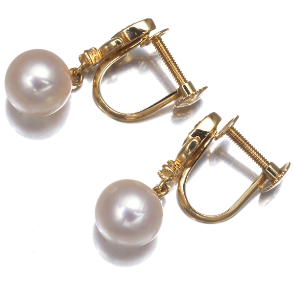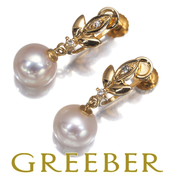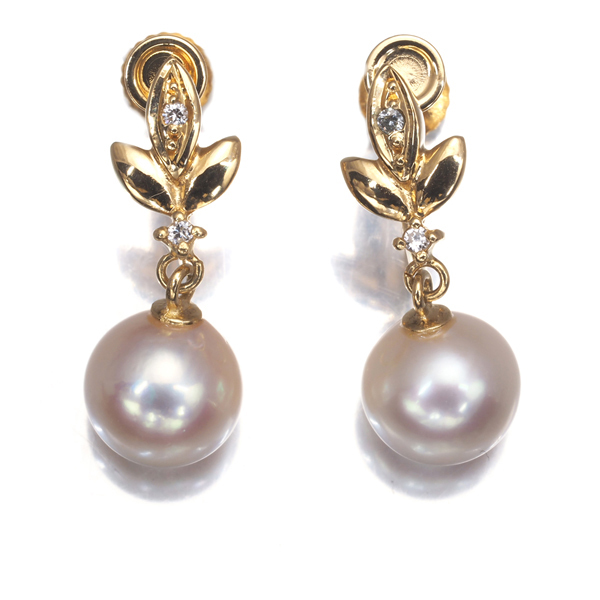 メレダイヤ煌めくゴールドリーフのエレガントなデザイン下部で鮮やかなテリと美しい干渉色浮かべる上質アコヤ真珠が揺れ輝くイヤリングです。 |
