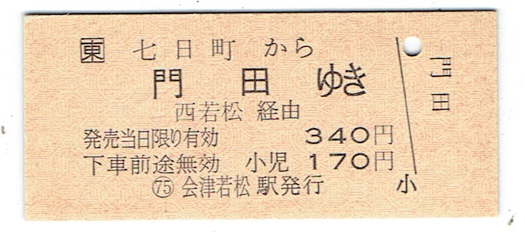 | 《JR硬券 乗車券》七日町から門田ゆき 会津若松駅発行 | |