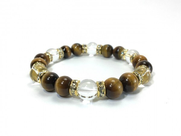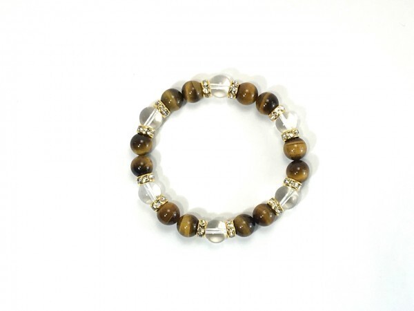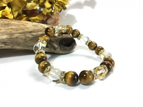 こちらは、タイガーアイと水晶を組み合わせたブレスレットです。間にはロンデルを挟み高級感あるデザインに仕上がっています。石大きさは腕にも馴染みやすいように10mm玉で内径約18cm(伸可能)です。数に限りがございますので気になる方はお早めにどうぞ。サイズ調節も可能ですのでサイズ調節の場合は取引ナビにてご一報くださいませ。(サイズ調節無料です)