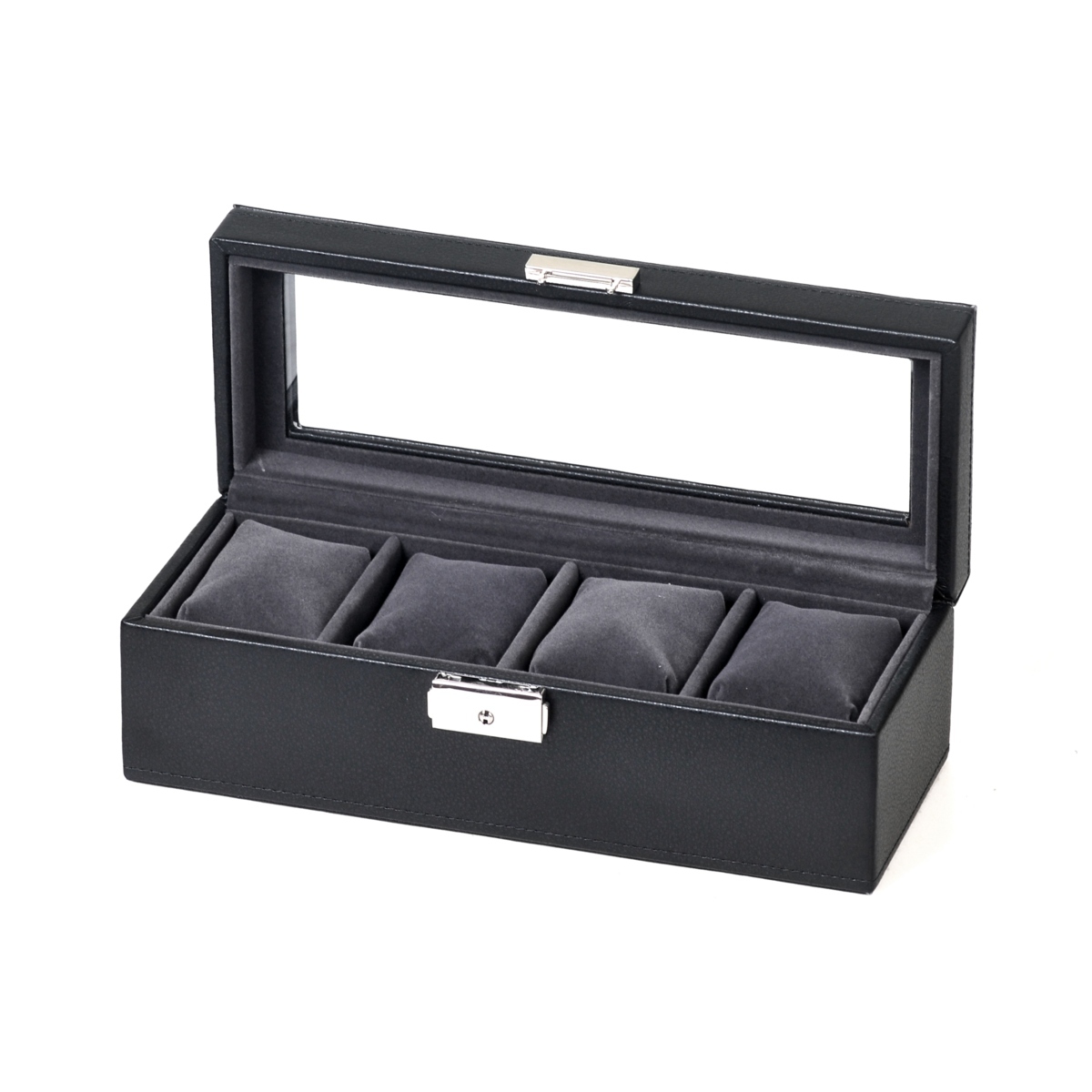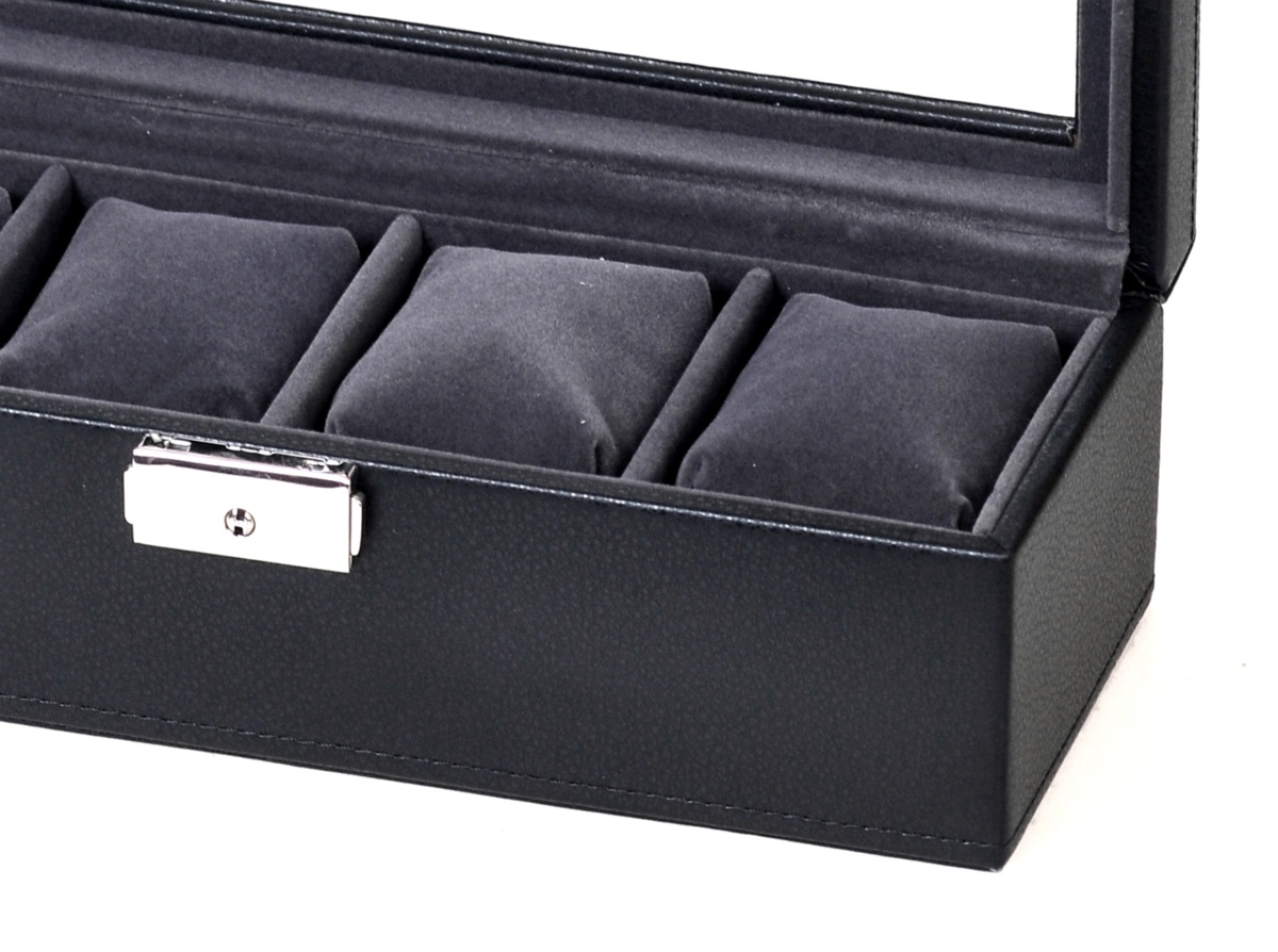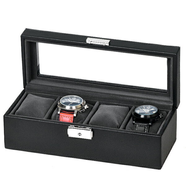 ワインディングマシーン・収納ケースにおいて 国内・海外トップクラスのシェアを誇る エスプリマ社が展開する新製品!合成皮革4本用時計収納ケースです。 低コストで量産した収納ケースとは違い、組立・素材・面取り処理が綺麗な仕上りです。 重量感のあるケース本体とブラックカラーの映えるデザインが好評。メンズ・レディースといったカテゴリーを選ばず、時計ホルダーは伸縮性のあるクッションタイプで収納スペースはメンズ・レディース問わずお使い頂けるのがポイント!天窓はガラスですので明るいお部屋ですとソーラー腕時計が充電ができるのは便利です。腕時計のプレゼントとあわせて収納ケースもプレゼントにご検討下さい。。